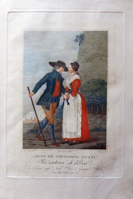 Niccolò Pagni e Giuseppe Bardi, Firenze, 1796. Tratta dall'opera "I contadini della Toscana" (la serie completa è composta da un frontespizio e da 60 tavole di costumi), incisione in rame all'acquaforte stampata a colori, cm 23,5 x 34,5 circa (alla lastra) più ampi margini. In basso a sinistra, in lastra "Ant. Bicci del."; in basso a destra, in lastra “Cavini inc.” (su disegno di Antonio Bicci e con l'inciso di Pietro Zancon), non si legge il numero di tavola. Carlo Lasinio, incisore e pittore (Treviso, 1759 - Pisa, 1838) diresse la realizzazione dell'opera, confermandosi un grande illustratore dotato di ottimo gusto decorativo. Buon esemplare in margini e in vivace coloritura.