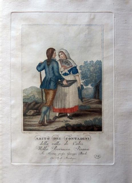 Niccolò Pagni e Giuseppe Bardi, Firenze, 1796. Tratta dall'opera "I contadini della Toscana" (la serie completa è composta da un frontespizio e da 60 tavole di costumi), incisione in rame all'acquaforte stampata a colori, cm 23,5 x 34,5 circa (alla lastra) più ampi margini. In basso a sinistra, in lastra "Ant. Bicci dis."; in basso a destra, in lastra “Gius. Canacci inc.” (su disegno di Antonio Bicci e con l'inciso di Pietro Zancon), tavola 52. Carlo Lasinio, incisore e pittore (Treviso, 1759 - Pisa, 1838) diresse la realizzazione dell'opera, confermandosi un grande illustratore dotato di ottimo gusto decorativo. Buon esemplare in margini e in tenue vivace coloritura.