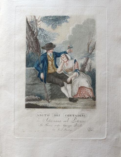 Niccolò Pagni e Giuseppe Bardi, Firenze, 1796. Tratta dall'opera "I contadini della Toscana" (la serie completa è composta da un frontespizio e da 60 tavole di costumi), incisione in rame all'acquaforte stampata a colori, cm 23,5 x 34,5 circa (alla lastra) più ampi margini. In basso a sinistra, in lastra "Ant. Bicci dis."; in basso a destra, in lastra “Gius. Canacci inc.” (su disegno di Antonio Bicci e con l'inciso di Pietro Zancon), tavola 60. Carlo Lasinio, incisore e pittore (Treviso, 1759 - Pisa, 1838) diresse la realizzazione dell'opera, confermandosi un grande illustratore dotato di ottimo gusto decorativo. Buon esemplare in margini, tenue vivace coloritura.