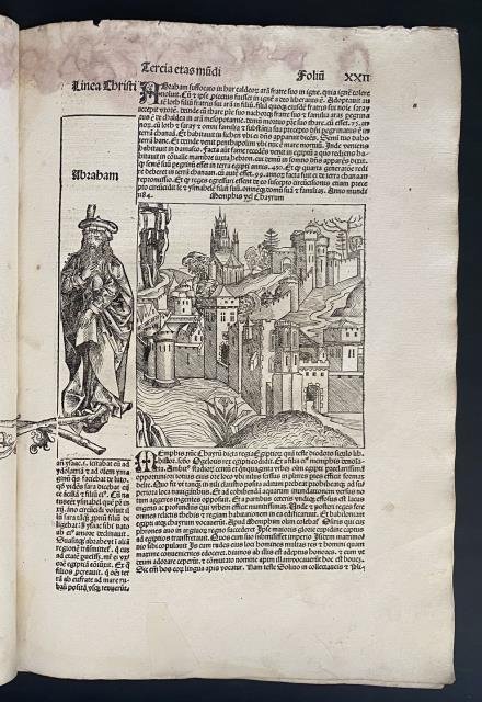 Dal “Liber Chronicarum Nurembergensi”, Norimberga, 1493. Foglio XXII. Xilografie stampate su pagina singola, b/n, cm 32,5, x 47,5 circa (il foglio). Al recto del foglio la città del Cairo con il suo tempio (o così almeno reca il titolo) con alla sinistra la grande figura di Abramo che posa i suoi piedi sull'albero genealogico che prosegue i robusti rami dal verso del foglio antecedente (il XXI) e che qui termina narrativamente il suo sviluppo; al verso del foglio scena biblica con angelo in cielo che ferma una spada. Foglio interessato da presenza rosso - violacea, il cosiddetto fungo rosso, ma al solo margine superiore, peraltro ben impresso e in buono stato di conservazione. .