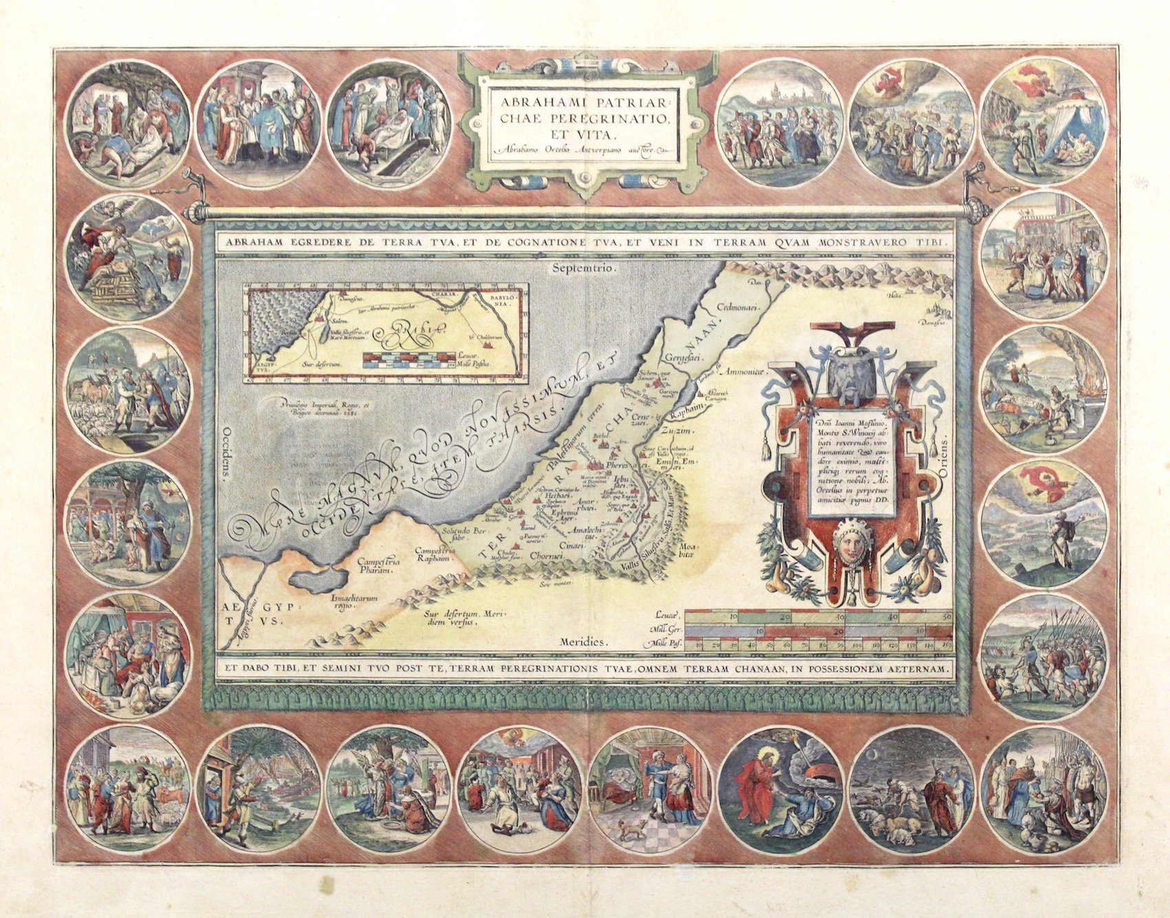 Copper engraving, mm 352x457, original color. "The Holy Land map itself occupies the centre and is surrounded by vignettes of the life of the Patriarch Abraham. Extremely decorative map made by Ortelius, based on Ptolemy, but mostly on the bible, particularly for the illustrations of Abraham's life from his departure from Ur to his death, depicted in 22 medallions".<BR>Laor, Maps of the Holy Land, 547, p. 78-79; Van den Broecke, 182. <BR>