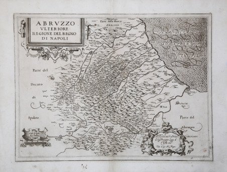 A sinistra, in alto nel cartiglio, troviamo il titolo ABRUZZO ULTERIORE REGIONE DEL REGNO DI NAPOLI. Nel piccolo cartiglio in basso la scala grafica Scala di Miglia dieci Italiane (10 miglia pari a mm 60). In basso a destra è inciso un cartiglio con la dedica All’ Ill.mo et Ecc.mo mio S.r ' et P[at]ron[us] Col.o il Sig.r Prencipe Luigi d’Este etc. segue l’imprint editoriale Fabio di Gio[vanni] Ant.o Magini. Carta priva di orientazione e graduazione ai margini. La carta deriva direttamente da quella realizzata da Natale Bonifacio nel 1587, rispetto alla quale presenta però meno informazioni. Probabile quindi che il ' Magini, come per tutte le carte del Regno di Napoli, si ispirò al rilievo ufficiale eseguito dallo studioso nolano Niccolò Antonio Stigliola il collaborazione con il cartografo viterbese Mario Cartaro, che tra il 1583 ed il 1594 ebbero l’incarico di realizzare una grande carta del reame. ' Esemplare di secondo stato, con aggiunto il cartiglio in basso a destra – che contiene la dedica di Fabio Magini al principe Luigi d’Este. Per un esemplare di primo stato consultare la nostra scheda https://www.antiquarius.it/it/abruzzo/3193-abruzzo-ulteriore-regione-del-regno-di-napoli.html Tavola tratta dal ' L’Italia ' a cura di Fabio Magini, edito a Bologna nel 1620, tre anni dopo la prematura morte del padre. Composto da un breve testo descrittivo di sole 24 carte, l’opera è corredata di 61 carte geografiche della penisola, e costituisce il primo esempio di atlante italiano. L’opera è per intero di mano del Magini, che iniziò la realizzazione delle carte nel 1594 circa, dando alla luce per prima nel 1595 la carta del territorio di Bologna. Tutte le carte vennero alle stampe quindi prima del 1620, nelle loro stesure provvisorie, successivamente corrette ed aggiornate per l’edizione definitiva. Per la realizzazione delle lastre il Magini si servì di due dei più famosi intagliatori dell’epoca: il belga Arnoldo Arnoldi e l’inglese Benjamin Wright. Incisione in rame, in ottimo stato di conservazione. Bibliografia Almagià, L'Italia di Giovanni Antonio Magini e la Cartografia dell'Italia nei secoli XVI e XVII (1922), pp. 73-78, n. 20. A sinistra, in alto nel cartiglio, troviamo il titolo ABRUZZO ULTERIORE REGIONE DEL REGNO DI NAPOLI. Nel piccolo cartiglio in basso la scala grafica Scala di Miglia dieci Italiane (10 miglia pari a mm 60). In basso a destra è inciso un cartiglio con la dedica All’ Ill.mo et Ecc.mo mio S.r ' et P[at]ron[us] Col.o il Sig.r Prencipe Luigi d’Este etc. segue l’imprint editoriale Fabio di Gio[vanni] Ant.o Magini. Carta priva di orientazione e graduazione ai margini. La carta deriva direttamente da quella realizzata da Natale Bonifacio nel 1587, rispetto alla quale presenta però meno informazioni. Probabile quindi che il ' Magini, come per tutte le carte del Regno di Napoli, si ispirò al rilievo ufficiale eseguito dallo studioso nolano Niccolò Antonio Stigliola il collaborazione con il cartografo viterbese Mario Cartaro, che tra il 1583 ed il 1594 ebbero l’incarico di realizzare una grande carta del reame. ' Esemplare di secondo stato, con aggiunto il cartiglio in basso a destra – che contiene la dedica di Fabio Magini al principe Luigi d’Este. Per un esemplare di primo stato consultare la nostra scheda https://www.antiquarius.it/it/abruzzo/3193-abruzzo-ulteriore-regione-del-regno-di-napoli.html Tavola tratta dal ' L’Italia ' a cura di Fabio Magini, edito a Bologna nel 1620, tre anni dopo la prematura morte del padre. Composto da un breve testo descrittivo di sole 24 carte, l’opera è corredata di 61 carte geografiche della penisola, e costituisce il primo esempio di atlante italiano. L’opera è per intero di mano del Magini, che iniziò la realizzazione delle carte nel 1594 circa, dando alla luce per prima nel 1595 la carta del territorio di Bologna. Tutte le carte vennero alle stampe quindi prima del 1620, nelle loro stesure provvisorie, successivamente corrette ed aggiornate per l’edizione definitiva. Per la realizzazione delle lastre il Magini si servì di due dei più famosi intagliatori dell’epoca: il belga Arnoldo Arnoldi e l’inglese Benjamin Wright. Incisione in rame, in ottimo stato di conservazione. Bibliografia Almagià, L'Italia di Giovanni Antonio Magini e la Cartografia dell'Italia nei secoli XVI e XVII (1922), pp. 73-78, n. 20. Cfr.