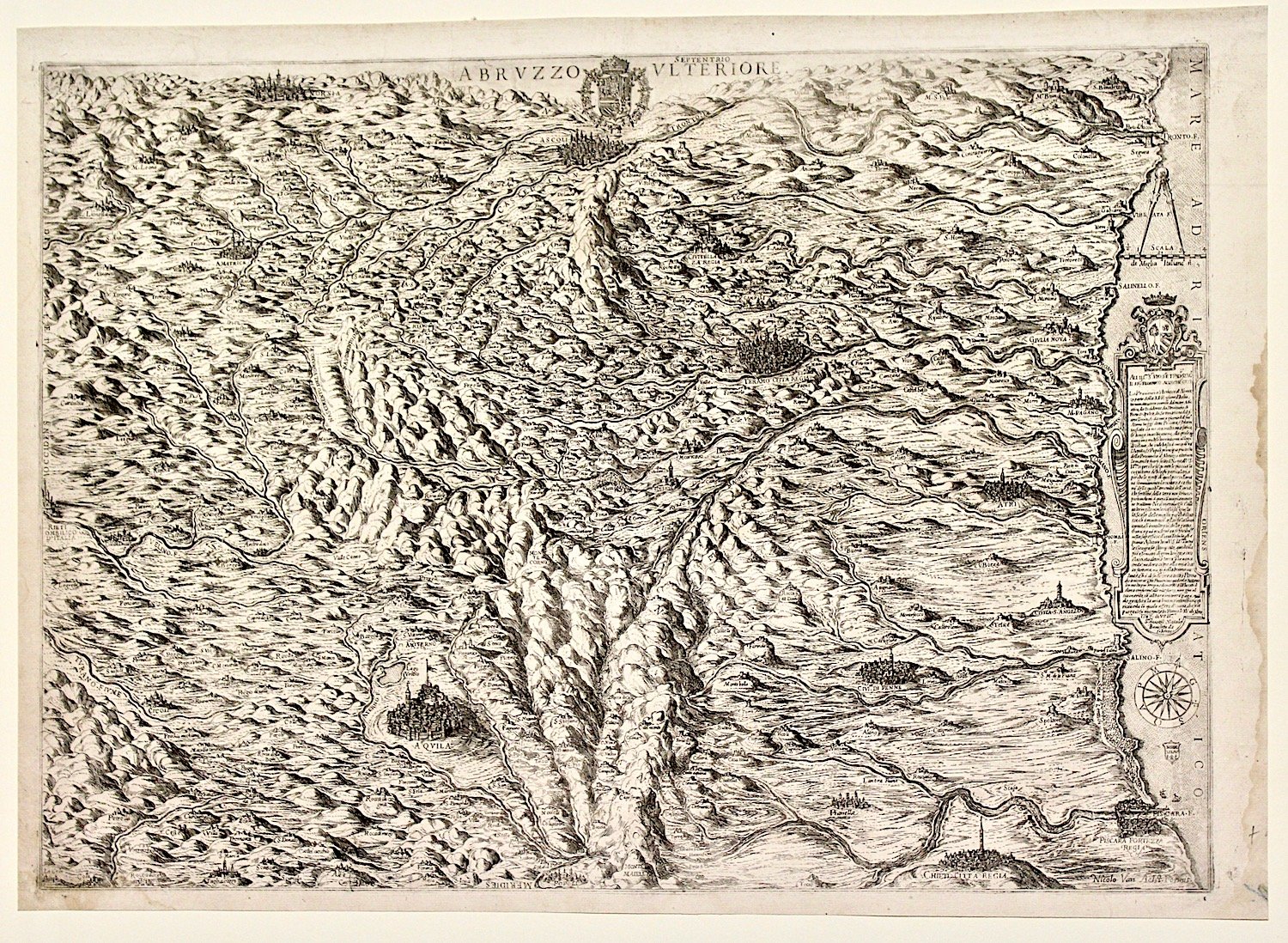 Incisione in rame ad acquaforte e bulino, mm 353x492. Rarissima carta, molto pittorica, per cui Bonifacio viene ispirato dalla raffigurazione di Egnazio Danti nella Galleria Vaticana, anche se la prospettiva è del tutto originale così come i contenuti, come pare chiaro dalla dedica, ricavati da verifiche fisiche sul territorio. Al centro in alto il titolo e le armi del re di Napoli, Filippo II. A destra appaiono la scala grafica, la dedica ed una rosa dei venti ed in basso la firma dell'incisore "Nicolo Van Aelst Formis". Molto evidenti le città che Bonifacio riproduce nel loro effettivo dettaglio topografico. Da sempre definita come rarissima, anche dallo stesso grande studioso Almagià, fu stampata in questa unica edizione e non si conoscono tirature posteriori della lastra ad opera di altri editori. <BR>Almagià, Monumenta Cartographica Vaticana, II, pag. 6-7; Almagià, Monumenta Italiae Cartographica, pag. 46; Lago, Imago mundi et Italiae, pag. 274/281; Perini, L'Italia e le sue regioni nelle antiche carte geografiche, pag. 113; Bifolco-Ronca, Cartografia rara italiana: XVI secolo, pag. 304, tav. 126.