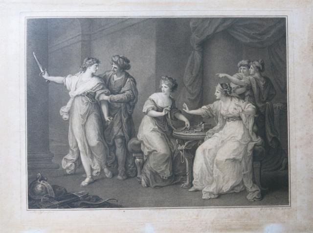 John & Josiah Boydell, excudit 1786. Litografia in b/n, cm 48,5 x 62,5 (alla lastra), in bs. a ds. "Angelica Kauffman pinxit", in bs. a sn. "G. S. & I. G. Facius Sculpserunt". Angelica Kauffman (Coira, Grigioni, 1741 – Roma, 1807), è stata una pittrice svizzera, specializzata nella ritrattistica e nei soggetti storici. Avviata all'arte dal padre Joseph Johann, si rivelò una fanciulla prodigio. Studiò in seguito a Milano (1754), viaggiò per l'Italia, fino a Roma (1763) dove conobbe e fu amica del Winckelmann, poi visse a Londra (1766 - 81), raccogliendovi i maggiori successi artistici e mondani (lavorò anche per l'architetto R. Adam). Dopo il matrimonio col pittore A. Zucchi, si stabilì a Roma, dove il suo salotto di via Sistina fu frequentato dai più noti personaggi, residenti o di passaggio a Roma (Goethe, Tischbein, Herder, principi e principesse) molti dei quali si fecero ritrarre da lei. Le numerosissime opere della Kauffman, (ritratti, scene storiche e mitologiche, storiche) sono segnate da un aggraziato eclettismo classicheggiante, e sono conservate nei maggiori musei europei. Achille scoperto da Ulisse tra le Figlie di Licomede è stato dipinto da Angelica Kauffman più volte: la prima composizione è datata 1769, la seconda versione è stata completata nel 1786 ed è ormai nota solo attraverso la presente incisione del Facius del 1786. La Kauffman era molto nota anche per le numerose incisioni, privilegiate dai collezionisti. Esemplare con alcune lievi abrasioni, uniformemente ingiallito e con fioriture ai margini, buono il figurato.