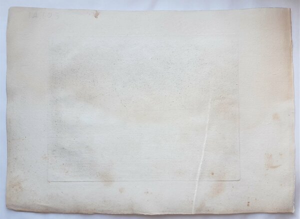 Misure foglio cm. 25 x 35 l'incisione cm. 18 x 23,7 in discreto stato alone di umidità su quasi tutto il foglio, alcune fioriture e piccole pieghe ai margini, una piega al margine inferiore che va ad interessare la stampa al lato sinistro, margine sinistro rifilato