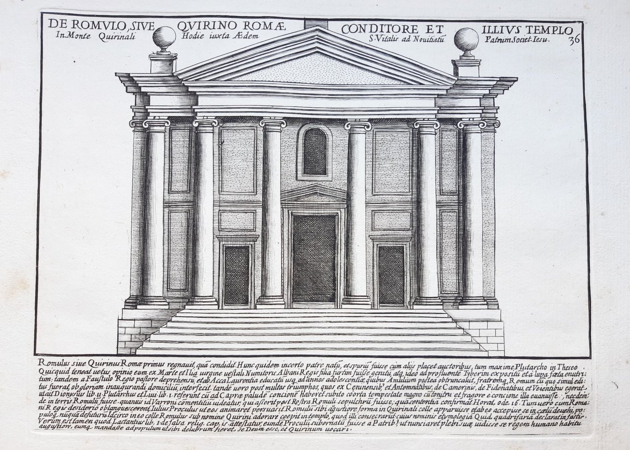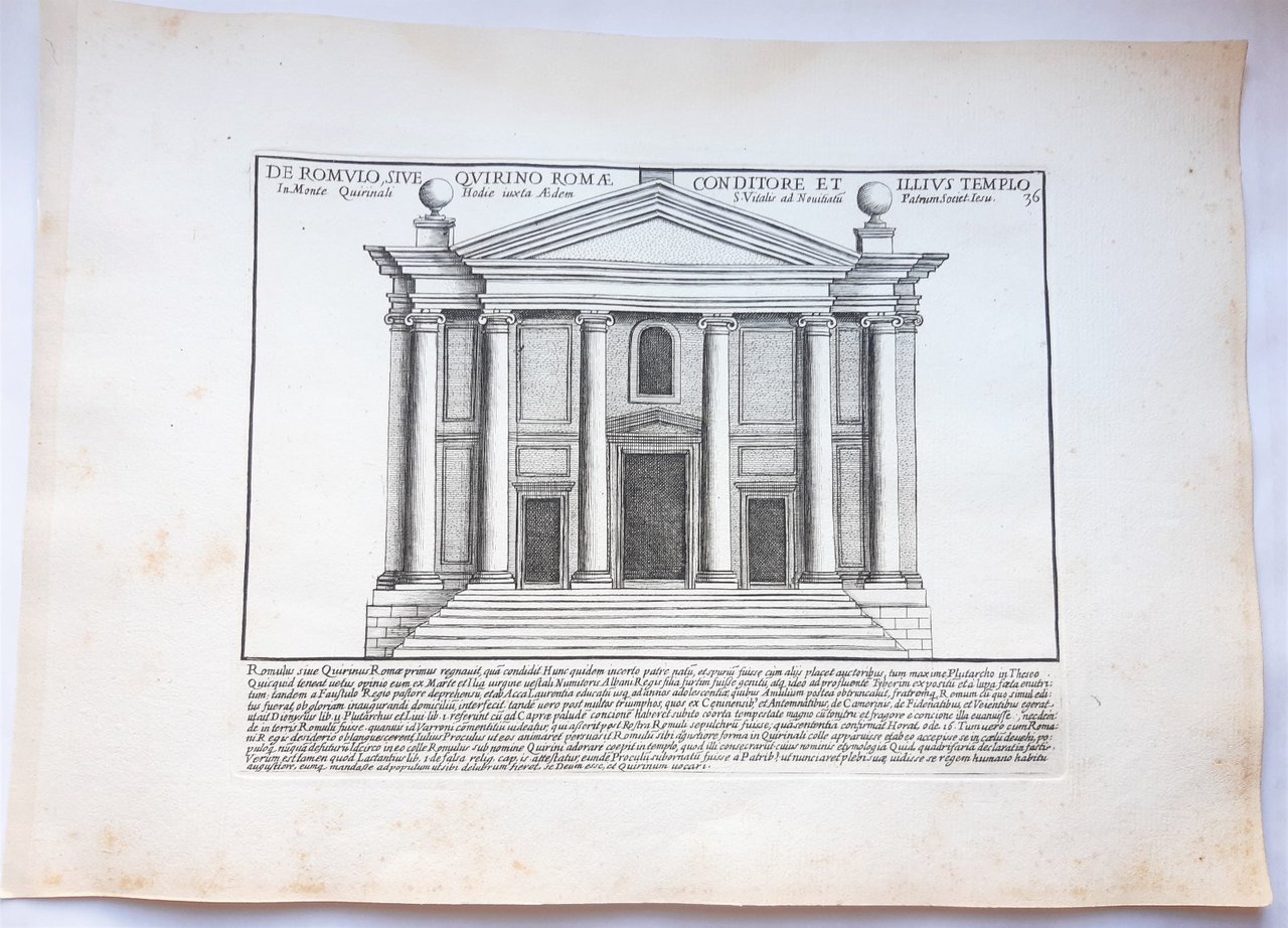 Acquaforte old print Romanae magnitudinis Roma facciata del Tempio Romolo Quirino G. Lauro 1699