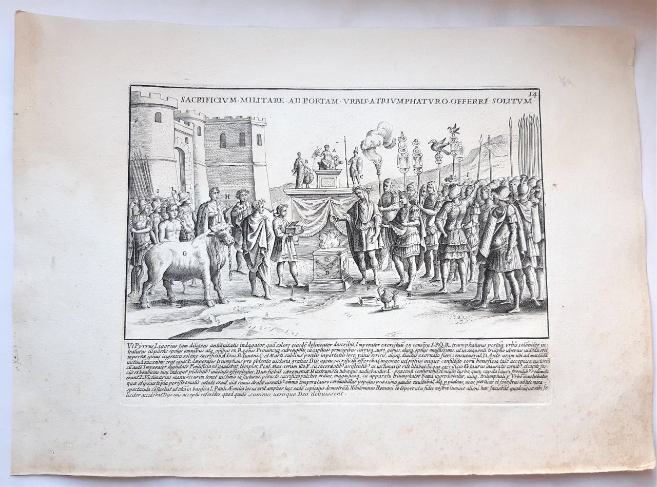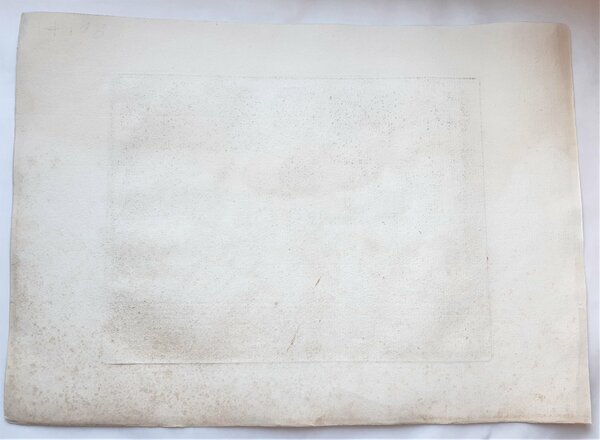 Misure foglio cm. 25 x 35 l'incisione cm. 18 x 23,7 in discreto stato alone di umidità su quasi tutto il foglio, fioriture diffuse al margine inferiore, margine sinistro rifilato