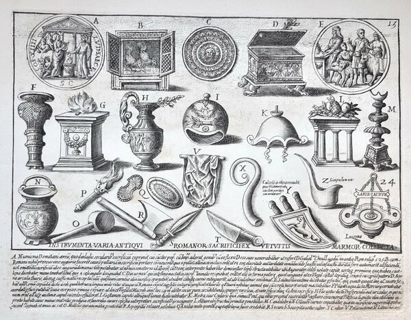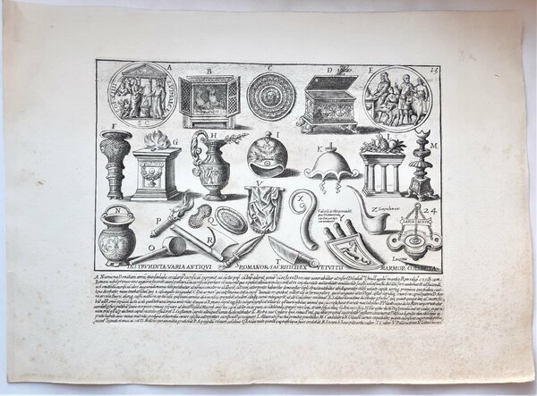 Acquaforte old print Romanae magnitudinis Vari strumenti degli antichi romani G. Lauro 1699