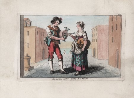 Scena di costume popolare nel tipico stile di Bartolomeo Pinelli, tratta dalla rara ' Raccolta di cinquanta costumi li più interessanti delle città, terre, e paesi, in provincie diverse del Regno di Napoli disegnati, ed incisi all’acquaforte da Bartolomeo Pinelli Romano Dedicati ' stampato ' In Roma, MDCCCXII. Presso Giovanni Scudellari in Via Condotti n. 19 e 20. Bella e rara edizione nella quale sono raffigurati costumi, mestieri e scene di vita popolare del Regno di Napoli. Pinelli, fu stampatore, pittore, scultore e disegnatore; apprese i rudimenti della scultura dal padre, artigiano di piccole statuette religiose di scarso valore. Questo apprendistato in tenera età incoraggiò Pinelli ad enfatizzare la plasticità e l’espressione rispetto ai valori del Neo-Classicismo, predominanti a Roma. Purtroppo, sono pervenute fino a noi solo pochi esemplari delle sue sculture in terracotta, mentre conosciamo il volume di acqueforti, ' Gruppi pittoreschi ' (Roma, 1834), con rappresentazioni di popolani. L’enfasi sul naturalismo e su soggetti di vita quotidiana è di nuovo evidente. Sebbene avesse studiato presso l’Accademia di Belle Arti a Bologna, sostenuto economicamente dal Conte Lambertini, il nipote di Papa Benedetto XIV, Pinelli non aveva interesse a seguire l'iter tradizionale del successo artistico attraverso i soggetti religiosi. Di ritorno a Roma, alla fine del XVIII secolo, decise di vendere le sue opere nei caffè frequentati dai turisti. ' Incisione in rame, finemente colorata a mano, in ottimo stato di conservazione. Popular costume scene in the typical style of Bartolomeo Pinelli, taken from the rare ' Raccolta di cinquanta costumi li più interessanti delle città, terre, e paesi, in provincie diverse del Regno di Napoli disegnati, ed incisi all’acquaforte da Bartolomeo Pinelli Romano Dedicati ' printed ' In Roma, MDCCCXII. Presso Giovanni Scudellari in Via Condotti n. 19 e 20. Rare and beautiful series depicting individual and group popular costumes of the Kingdom of Naples (southern Italy). Pinelli was an Italian printmaker, painter, sculptor and draughtsman. He learnt the rudiments of sculpture from his father, a maker of cheap religious statuettes. This early training encouraged Pinelli to emphasize plasticity and expression over the Neo-classical values prevalent in Rome. Although only a few of his terracotta figures survive however, he did produce a volume of etchings, ' Gruppi pittoreschi ' (Rome, 1834), depicting rustic groups. Its emphasis on naturalism and everyday subject-matter is also characteristic of his sculptures. Although he studied both at the Accademia di San Luca in Rome and at the Accademia di Belle Arti in Bologna, helped financially by Conte Lambertini, Pope Benedict XIV’s nephew, Pinelli was not interested in pursuing the traditional path to artistic success via religious or history painting. On returning to Rome in the late 1790s he chose to peddle his works at the cafés frequented by tourists. Copperplate, finely hand coloured, in excellent condition. Cfr.