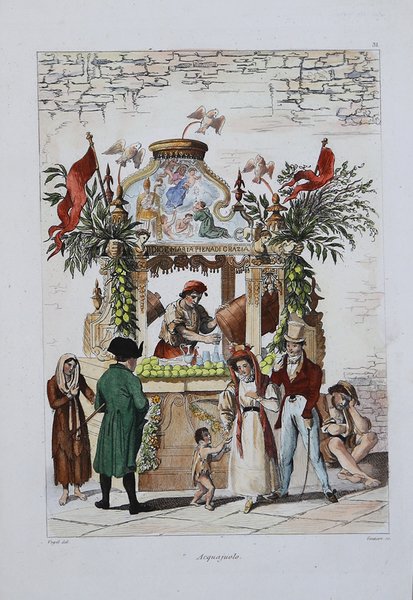 Tavola tratta dal celebre L'Italie, la Sicile, les Iles Éoliennes, l'Ile d'Elbe, la Sardaigne, Malte, l'Ile de Calypso etc. D'après les inspirations, les recherches et les travaux de M. M. le Vicomte de Chateaubriand, De Lamartine, Raoul-Rochette, le Comte de Forbin, Piranesi, Mazzara, et de Napoléon, Denon, Saint-Non, Lord Byron, Goethe, Visconti, Cicognara, Lanzi, de Bonstetten, Swinburne, etc. Sites, Monumens, Scènes et Costumes, d'après M.me Haudebourt-Lescot, MM. Horace-Vernet, Granet, Isabey, Ciceri, Mazzara, le Major Light, le Cap. Batty, Cooke, Gell et Gandy, Pinelli, Ferrari, Zucoli, et beaucoup d'autres artistes italiens. Recueillis et publiés par Audot Père, Membre de la Société de Géographie, edito a Parigi tra il 1834 ed il 1837 e ristampato a Torino [Giuseppe Pomba e Ca, 1834-1838]. L'opera, in cinque volumi, raccoglie scritti di autori vari, curati da Audot, ed è riccamente illustrata da 324 incisioni su acciaio fuori testo, molte delle quali con accostamento multiplo, per un totale di 473 tavole. Fu notoriamente mastodontico il lavoro cui si sottopose Louis Eustache Audot (1783-1870). ' Finemente colorata a mano. Plate taken from the famous L'Italie, la Sicile, les Iles Éoliennes, l'Ile d'Elbe, la Sardaigne, Malte, l'Ile de Calypso etc. D'après les inspirations, les recherches et les travaux de M. M. le Vicomte de Chateaubriand, De Lamartine, Raoul-Rochette, le Comte de Forbin, Piranesi, Mazzara, et de Napoléon, Denon, Saint-Non, Lord Byron, Goethe, Visconti, Cicognara, Lanzi, de Bonstetten, Swinburne, etc. Sites, Monumens, Scènes et Costumes, d'après M.me Haudebourt-Lescot, MM. Horace-Vernet, Granet, Isabey, Ciceri, Mazzara, le Major Light, le Capt. Batty, Cooke, Gell et Gandy, Pinelli, Ferrari, Zucoli, et beaucoup d'autres artistes italiens. Recueillis et publiés par Audot Père, Membre de la Société de Géographie, published in Paris between 1834 and 1837 and reprinted in Turin [Giuseppe Pomba e Ca, 1834-1838]. The work, in five volumes, collects the writings of various authors, edited by Audot, and is richly illustrated with 324 engravings on steel outside the text, many of them with multiple combinations, for a total of 473 tables. Louis Eustache Audot (1783-1870) was a notoriously mammoth task. ' Finely hand-colored. Cfr.