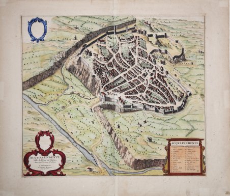 Pianta prospettica della città basata sul modello disegnato Raffaello Guicciardi nel 1582. L'opera è per la prima volta pubblicata nel ' Theatrum Civitatum et admirandorum Italiae, ' stampato da Johannes Blaeu ad Amsterdam nel 1663. Questo esemplare è tratto dal ' Nouveau Theatre de l'Italie ' pubblicato ad Amsterdam nel 1704/5 da Pierre Mortier e ristampato da R. Alberts nel 1724. Johannes Blaeu, durante la sua lunga attività editoriale pubblica tre volumi sulle città italiane. Nel 1663 i primi tre, suddivisi in Stato della Chiesa, Roma e Regno di Napoli e Sicilia. Alla sua morte i suoi eredi danno alla luce altri due volumi datati 1682 incentrati sulle città del Piemonte e della Savoia, poi ristampati da altri editori nel 1693 e 1697. ' ' Il francese Pierre Mortier pubblica una ristampa nel 1704/5, intitolata Nouveau Theatre de l’Italie. L’opera è in quattro volumi e comprende le lastre del Blaeu, ritoccate e modificate in piccola parte, integrate dall’aggiunta di numerose nuove mappe di proprio disegno, raffiguranti le città della parte settentrionale della penisola, racchiuse nel primo volume dell’opera. L’atlante del Mortier venne pubblicato con testo latino, francese e olandese. La particolarità che differenzia le due edizioni di Blaeu e Mortier è rappresentata dal fatto che il testo non è al verso della singola mappa (che quindi è bianca nel retro), ma si trova all’inizio di ogni singolo volume. Il grande successo dell’opera diede origine ad un’ulteriore ristampa, praticamente identica, curata da R. Alberts ed edita nel 1724/5. Le opere tratte dalla prima edizione del Blaeu, 1663, sono caratterizzate dalla presenza del testo al verso, qui assente. Incisione in rame, finemente colorata a mano, in ottimo stato di conservazione. Perspective plan of the city based on the model drawn by Raffaello Guicciardi in 1582. Work first included in ' Theatrum Civitatum et Admirandorum Italiae ad aevi veteris & praesentis temporis faciem expressum à Ioanne Blaeu G. F., ' printed by Johannes Blaeu, Amsterdam, 1663. Example taken from ' Nouveau Theatre de l'Italie ' - Amsterdam nel 1704/5 - by Pierre Mortier or from the da R. Alberts issue (1724). Without descriptive text on the back. The ' Theatrum Civitatum et Admirandorum Italiae ' is the first monumental town book entirely covering Italy, preceded by the "pocket-size" ' Italia Hodierna ' by Jodocus Hondius jr. (1627) and realized in likely competition with Johannes Janssonius who, in 1657, published the ' Theatrum praecipuarum urbium, ' containing a volume dedicated to Italy. Johannes Blaeu, during his long editorial activity published three volumes on Italian cities. In 1663 the first three, divided into the State of the Church, Rome and the Kingdom of Naples and Sicily. At his death his heirs gave birth to two more volumes dated 1682 focused on the cities of Piedmont and Savoy, then reprinted by other publishers in 1693 and 1697. Pierre Mortier publishes a reprint in 1704/5, entitled ' Nouveau Theatre de l'Italie. The work is in four volumes and includes the plates of Blaeu, retouched and modified in small part, supplemented by the addition of several new maps of his own design, depicting the cities of the northern part of the peninsula, enclosed in the first volume of the work. Mortier's atlas was published with Latin, French and Dutch texts. The great success of the work gave rise to a further reprint, virtually identical, edited by R. Alberts and published in 1724/5. Etching, later hand colour, very good condition. Cfr.