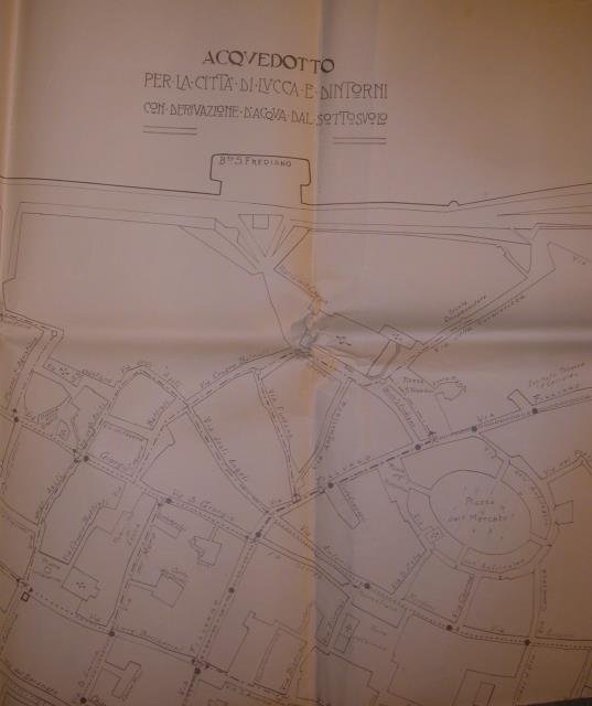 Grande planimetria della città di Lucca in formato cm.110x240. Con indicazione degli Sfiatatoi, Idranti, Pozzetti per lo Scarico, Riduzioni, Tubazioni in ghisa e in ferro zingato. Codice libreria 113558.