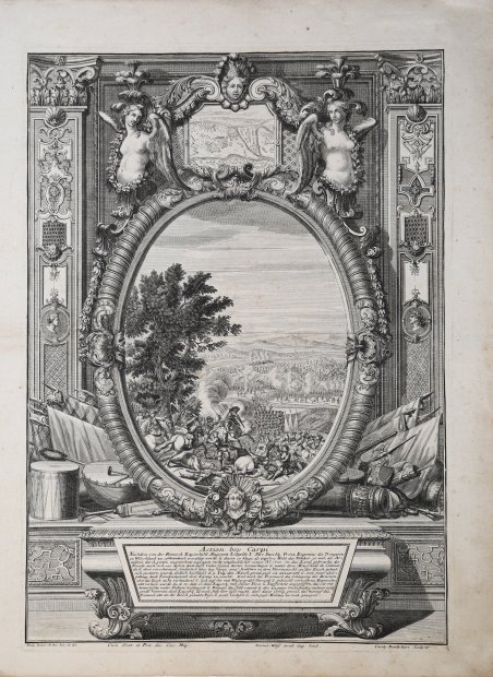Bellissima incisione raffigurante la battaglia del 1701, racchiusa entro una cornice ornamentale riccamente decorata. ' Tavola tratta dalla Repraesentatio Belli, ob successionem in Regno Hispanico stampato ad Augsburg, circa 1720. Serie altamente decorativa che celebra le vittorie dell'Austria, di alcuni stati tedeschi, della Gran Bretagna, dell'Olanda, della Danimarca e del Portogallo nella guerra di successione spagnola, 1700-1713, conclusasi con i trattati di Utrecht e Rastatt. La maggior parte delle tavole comprende una sezione centrale con la rappresentazione di un particolare evento, questa sezione centrale è circondata da un'ampia bordura rococò che incorpora un pannello con un testo esplicativo in tedesco e un piccolo pannello contenente una mappa o una pianta dell'area in cui si è svolto l'evento nel pannello principale dopo Paul Decker il Vecchio (1677-1713), Georg Philip Rugendas e altri. ' Acquaforte, stampata su carta vergata coeva, con margini, ottimo stato di conservazione. Plate taken from the Repraesentatio Belli, ob successionem in Regno Hispanico. ' Augsburg: [c. 1720]. Highly decorative series celebrating the victories of Austria, some of the German states, Great Britain, Holland, Denmark and Portugal, in the War of the Spanish Succession, 1700-1713, which ended with the Treaties of Utrecht and Rastatt. Most of the plates include a central section with a representation of a particular event, this central section is surrounded by a wide rococo border incorporating a panel with explanatory text in German, and a small panel containing a map or plan of the area in which the event in the main panel took place after Paul Decker the Elder (1677-1713), Georg Philip Rugendas and others. Copperplate, printed on contemporary laid paper, with margins, very good condition. Cfr.