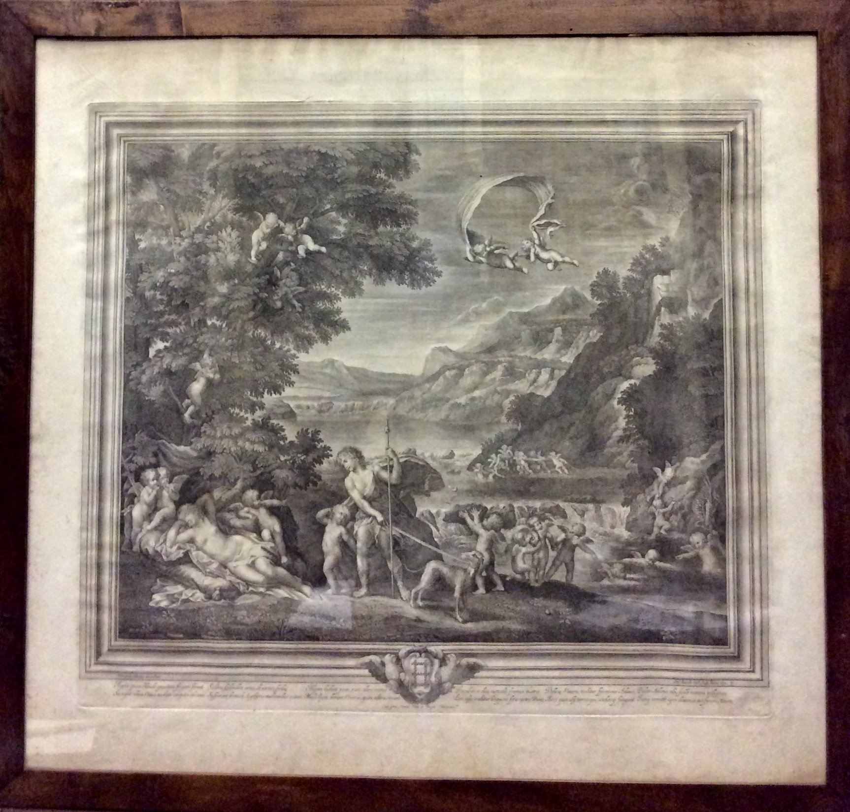 Grande e bellissima incisione a bulino (cm. 59 x 65,5 alla battuta) eseguita Etienne Baudet (Vineuil, 1638 - Parigi, 1711), tratta da un dipinto di Francesco Albani (1578-1660), il quale .. volgendosi poi a una visione sempre più vicina a quella del Domenichino, crea una serie di opere di un raffinato classicismo, quali le "quattro Storie di Venere" ora nella Galleria Borghese (Cfr. Treccani online).Ben conservata, con cornice in legno (cm. 78,5 x 83).