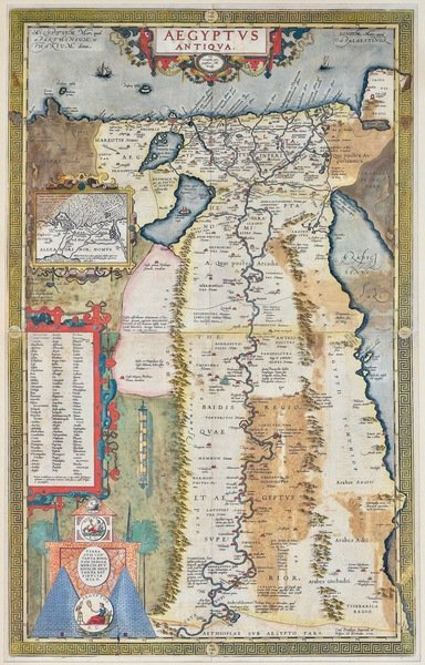 Incisione in rame, colore d'epoca, mm 790 x 480. Questa carta fu pubblicata per un periodo relativamente breve e fu sostituita nel 1595 da una carta nuova su foglio singolo. Ortelio dedicò a questa carta venti anni di studi scientifici realizzando fra l'altro anche esteticamente un piccolo capolavoro con fascinosi ricchi cartigli e due riquadri, di cui uno con carta di Alessandria e dintorni ed uno coi nomi geografici. Una fra le più belle carte di Ortelio. Dice Peter Meurer della Utrecht University "an outstanding example of early scientific research on Egypt".<BR>Tratta dal "Parergon" del "Theatrum Orbis Terrarum" il primo atlante moderno, comprendente carte di tutte le zone del mondo; la geniale intuizione di Ortels, latinizzato successivamente, fu appunto questa: prima d'allora la produzione cartografica era stata irregolare, locale a livello di produzione ed i pochi atlanti, i cosiddetti "Atlanti Lafreriani" erano costituiti su richiesta raccogliendo carte di alcune zone, ignorando le altre. Ortelius riunì in un unico corpus la produzione cartografica eterogenea del periodo, costituendo la base per un'impresa editoriale di enorme successo, pubblicata dal 1570 al 1612. Ottimo esemplare in bella coloritura, con tracce di ossidazione in controparte e due rotture (dovute alla ossidazione) con perdita parziale restaurate<BR>Copper engraving, original colour, mm 790 x 480. <BR>Ortelius updated an earlier version of the map first issued in 1576 for the historical section (Parergon) of the Theatrum, and appeared in only a few editions being replaced by a single sheet map in 1595. Peter Meurer of the University of Utrecht has rightly described this map as "an outstanding example of early scientific research on Egypt" - Ortelius' scholarship was never more apparent than in the extensive research he conducted over a 20 year period working on this map. The harmonious aesthetic composition, superb engraving work and generous size also makes this one of the most visually stunning of all Ortelius maps. General good condition, but oxidated in counterpart; two lacks restored. VAN DER BROECKE: 219-220<BR>