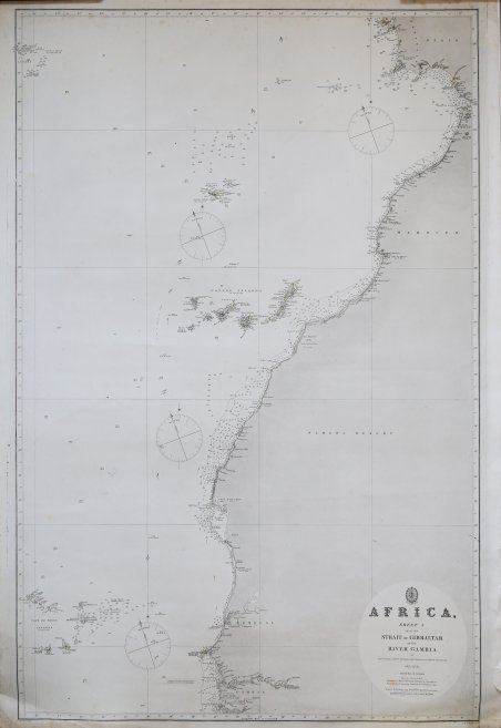 Africa sheet I from the Strait of Gibraltar to the River Gambia by Captain Vidal Comdr T Boteler, Lieut Arlett RN Baron Roussin etc 1821-29-35.Carta nautica delle coste occidentali dell'Africa, realizzata dal celebre idrografo inglese. Acquaforte su lastra di zinco, acciaiata, in buono sato di conservazione. Rara. Africa sheet I from the Strait of Gibraltar to the River Gambia by Captain Vidal Comdr T Boteler, Lieut Arlett RN Baron Roussin etc 1821-29-35.Nautical chart of west Africa by Walker. Updated to 1863.Steel engraving, good conditions. Rare. Cfr.
