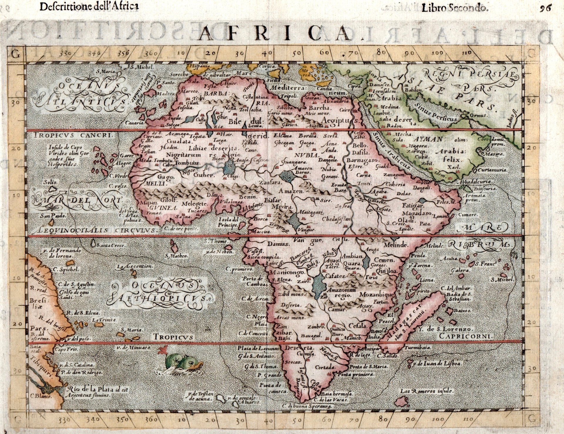 Incisione in rame, dipinta a mano, mm 175x247. Buon esemplare. Tratta dall'edizione della "Geografia" di Tolomeo, curata da Moleto e pubblicata dagli eredi Sessa, terza edizione nella traduzione di Ruscelli. La carta è basata su quella di Ortelio pubblicata in "Theatrum Orbis Terrarum". Bell'esemplare con traccia di pieghe. <BR>Girolamo Ruscelli (1500-1566) nasce a Viterbo ed è un importante scrittore ed editore, che dopo aver studiato a Padova trascorse la propria carriera fra Roma e Napoli, dove morì. <BR>Copperplate engraving, hand-painted mm 175x247. Good example. Based on Ortelis' map of America of 1570. Girolamo Ruscelli (1500-1566) was born in Viterbo and was an important writer and publisher, who after studying in Padua spent his career between Rome and Naples, where he died. <BR>