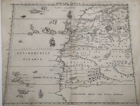 Rarissima carta geografica dell'Africa Occidentale, con gli arcipelaghi delle Canarie e Azzore.La mappa è tratta dal 'Geografia di M. Livio Sanuto : distinta in XII libri : ne quali, oltra l'esplicatione di molti luoghi di Tolomeo, e della Bussola, e dell'Aguglia, si dichiarano le Prouincie, Popoli, Regni. dell'Africa. Con XII tauole di esse Africa in dissegno di rame / aggiuntiui de piu tre Indici da M. Giouan Carlo Saraceni. ; [aiutato a ciò da Giulio suo fratello, che di propia mano tagliò tutti li Rami'.Si tratta del primo atlante dedicato esclusivamnete all'Africa, con le tavole disegnate da Livio Sanuto e finemente tradotte in rame dal fratello Giulio. L'opera venne pubblicata postuma a Venezia nel 1588, da Damiano Zenaro ed a cura di Carlo Saraceni.Incisione in rame, restauri perfettamente eseguit alla piega centrale ed a dei fori di tarlo presenti nella parte superiore ed inferiore, per il resto in ottimo stato di conservazione.Rara ed affascinante mappa dell'Africa. A very rare map of Western Africa, showing the Canary Islands & Azores.The map is taken form 'Geografia di M. Livio Sanuto : distinta in XII libri : ne quali, oltra l'esplicatione di molti luoghi di Tolomeo, e della Bussola, e dell'Aguglia, si dichiarano le Prouincie, Popoli, Regni. dell'Africa. Con XII tauole di esse Africa in dissegno di rame / aggiuntiui de piu tre Indici da M. Giouan Carlo Saraceni. ; [aiutato a ciò da Giulio suo fratello, che di propia mano tagliò tutti li Rami'.First printed atlas of Africa, published postumously by Sanuto's friend Saraceni who added the tables of contents and the preface on the life of the author.The maps were drawn by Sanuto and finely engraved by his brother Jules. The atlas is divided into twelve books, the first containing notes on scientific observation, the declination of the magnetic needle and corrections to the work, the second explains the divisions of Sanuto's prospective description of the world, and the other ten on Africa which was the only section he completed before his death.Livio Sanuto (c.1520-1576), was a Venetian cosmographer, mathematician and maker of terrestrial globes. Sanuto was one of the so-called Lafreri school of engravers, whose output signalled the transition between the maps of Ptolemy and the maps of Mercator and Ortelius. Livio and his brother Giulio, planned a massive and comprehensive atlas to include maps and descriptions of the whole world, which he believed would be more accurate than any previously published. Unfortunately, he died in 1576 having only completed 12 maps of Africa. The 12 maps were eventually published in 1588 by Livio's brother Giulio, under the title "Geografia Di M. Livio Sanuto." . In the compliation of this and the other African maps, Sanuto relied on Gastaldi's 1564 map and Portuguese sea charts for the mapping of the coasts and for information about the interior, used accounts by Duarte Barbosa and João de Barros. After its publication in 1588, this work was copied by other leading map makers for nearly a century afterwards.Seas are decorated with contemporary sailing vessels and monsters.Etching with engraving, some expert repairs at the central folds and at worm holes along the upper and lower edge, otherwise in good condition. Cfr. Betz, The Mapping of Africa, p. 145; Norwich, 15; Almagià 1946.