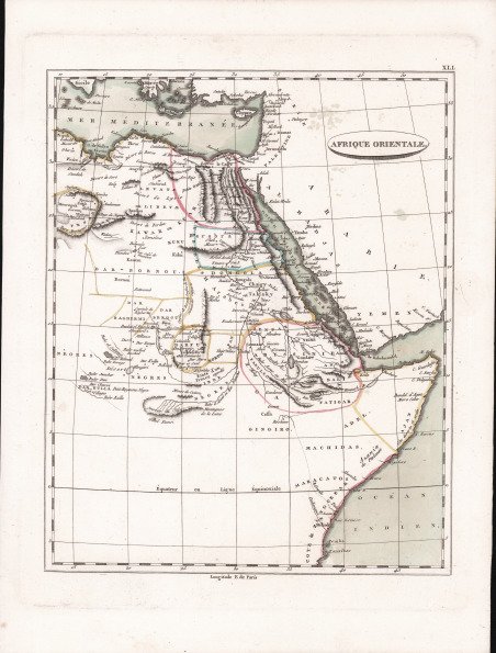 Carta geografica tratta dalla ' Géographie moderne, rédigée sur un nouveau plan, ou Description historique, politique, civile et naturelle des empires, royaumes, Etats et leurs colonies.: renfermant la concordance des principaux points de la géographie ancienne et du moyen âge, avec la géographie modern ' traduzione francese del trattato di Geografia di John Pinkerton, pubblicato a Parigi nel 1804. Le carte geografiche sono elaborate da Jean-Nicolas Buache su quelle disegnate da Aaron Arrowsmith per l’edizione inglese del trattato di Pinkerton. Jean-Nicolas Buache de La Neuville è stato un idrografo e geografo francese attivo tra la fine del XVIII e l'inizio del XIX secolo. Direttore del Dépôt des Cartes de la Marine, fu l'ultimo a fregiarsi del titolo di “primo geografo del re”. Eletto membro dell'Accademia delle Scienze nel 1770, fu incaricato da Luigi XVI di redigere nel 1788 le mappe dei baliati del regno di Francia. J. N. Buache era un ardente sostenitore delle idee cartografiche radicali di suo zio, Phillip Buache, riguardo all'ipotizzata esistenza di un "passaggio a nord-ovest". Come Phillip, Jean Nicholas credeva che la cartografia teorica, cioè l'applicazione delle teorie geografiche, potesse riempire i luoghi vuoti del globo prima che gli esploratori reali vi si recassero. Acquaforte con bellissima coloritura coeva, in ottimo stato di conservazione. Map taken from ' Géographie moderne, rédigée sur un nouveau plan, ou Description historique, politique, civile et naturelle des empires, royaumes, Etats et leurs colonies.: renfermant la concordance des principaux points de la géographie ancienne et du moyen âge, avec la géographie modern ' French translation of John Pinkerton's treatise on Geography, published in Paris in 1804. The maps are elaborated by Jean-Nicolas Buache on those drawn by Aaron Arrowsmith for the English edition of Pinkerton's treatise. Jean-Nicolas Buache de La Neuville was a French hydrographer and geographer active in the late 18th and early 19th centuries. Director of the Dépôt des Cartes de la Marine, he was the last to hold the title "first geographer to the king." Elected a member of the Academy of Sciences in 1770, he was commissioned by Louis XVI to draw up maps of the bailiwicks of the kingdom of France in 1788. J. N. Buache was an ardent supporter of the radical cartographic ideas of his uncle, Phillip Buache, regarding the hypothesized existence of a "northwest passage." Like Phillip, Jean Nicholas believed that theoretical cartography, that is, the application of geographical theories, could fill in the empty places on the globe before actual explorers went there. Etching with beautiful contemporary coloring, in excellent condition. Cfr.