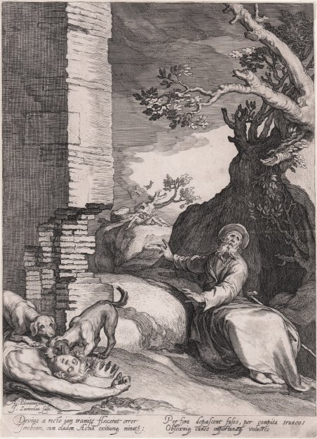 Bulino, 1604, firmato in basso a destra “A. Bloemart inve./ J. Saenredam Sculp.” Nel margine inferiore, quattro versi in latino, su due colonne. Stato unico.L’incisione appartiene alla serie di quattro della “Storia dei profeti Isaia Achia ed Elia”, incisa da Jan Pietersz Saenredam da soggetti di A. Bloemaert. Bella prova, impressa su carta vergata coeva, con filigrana “due stemmi araldici sormontati da corona”, traccia di piega di carta, un minuscolo foro nell’angolo superiore destro, nel complesso in ottimo stato di conservazione. Engraving, 1604, signed at lower right “A. Bloemart inve./ J. Saenredam Sculp.”Inscribed in the margin with two two-liners in Latin : Devius a recto iam tramite flexerat error/Jeroboam, cum cladem Achia extiumq minat:/ Per fora depascent fusos, per compita truncos/ Obscoeniq. caner importunaeq volucres”. Only state.From the series Four Scenes from the Life of the Prophets Isaiah, Ahajah and Elisha, engraving by J. Saenredam after A. Bloemaert.Good example, printed on contemporary laid paper with watermark “two crowned coat of arms”, smoothed trace of fold, tiny hole in the upper part, generally in very good condition. Cfr. Hollstein, 13