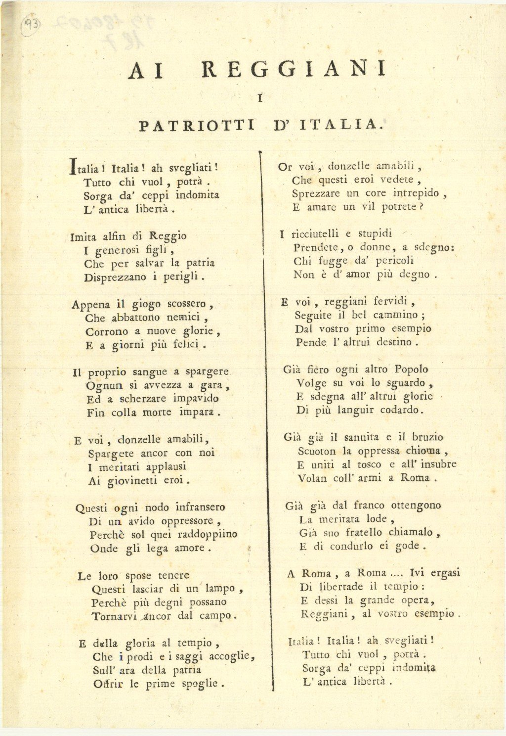 Documento, antico ed originale proveniente da importante collezione reggiana, in cui viene pubblicato un Sonetto patriottico ai reggiani