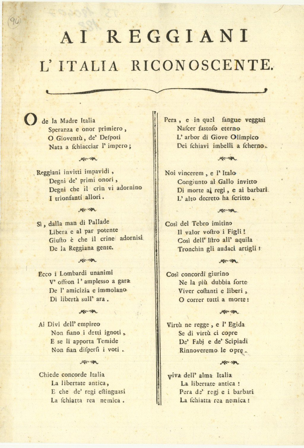Documento, antico ed originale proveniente da importante collezione reggiana, in cui viene pubblicato Sonetto patriottico ai reggiani