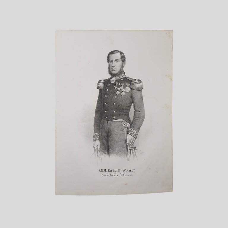 Litografia originale su carta di Gaetano Riccio, tratta da Domenico Valente, Storia della guerra di Sicilia, Napoli, 1862. Tavola sciolta, cm 35×25. Naturali tracce d’uso, alcune fioriture, in buone condizioni. Litografia originale raffigurante Ammiraglio Wright Comandante della nave la Costituzione. Durante l’assedio di Gaeta, la Costituzione dapprima cannonegiò le fortezze più interne della città della zona del faro, unitamente alle fregate Carlo Alberto e Vittorio Emanuele ed alla pirocorvetta Monzambano, poi in seguito al grave danneggiamento delle cannoniere Vinzaglio e Confienza. La tavola è tratta dall’opera di Domenico Valente, Storia dell’Italia centrale dopo la pace di Zurigo e della guerra di Sicilia e dei fatti posteriori, Napoli, A. Morelli, 1862. Una delle più importanti testimonianze iconografiche e narrative degli eventi legati alla spedizione dei Mille e alla successiva integrazione della Sicilia nel Regno d’Italia.Il ritratto, realizzato secondo il gusto ottocentesco, restituisce un’immagine ufficiale e celebrativa del personaggio, sottolineandone il ruolo istituzionale, militare o politico all’interno del processo risorgimentale. Si tratta di una stampa originale dell’epoca, non di una riproduzione moderna, destinata in origine alla consultazione e alla divulgazione storica, oggi apprezzata come documento collezionistico e iconografico. Esemplare di sicuro interesse per collezionisti di Risorgimento italiano, storia militare, iconografia ottocentesca e per studiosi del processo di unificazione nazionale.