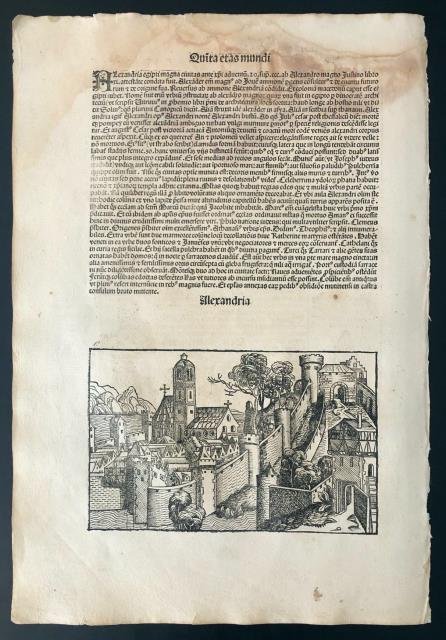 Anton Koberger, Norimberga, 1493. Dal “Liber Chronicarum Nurembergensi”, Norimberga, 1493. Foglio LXXVII. Xilografia stampata su pagina singola, b/n, cm 47,5 x 32,5 circa (il foglio). Al recto figure di filosofie pontefici; al verso veduta della città di Alessandria d'Egitto. Foglio interessato da leggera e contenuta presenza rosso - violastra, il cosiddetto fungo rosso, ma al solo margine superiore, peraltro ben impresso e in buono stato di conservazione. .