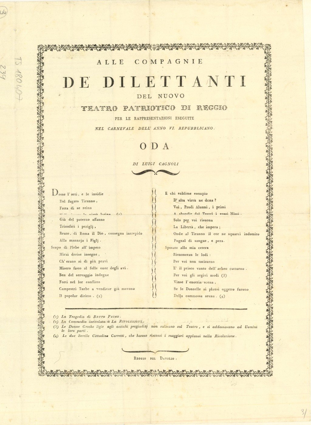 Documento, antico ed originale proveniente da importante collezione reggiana, con Oda di Luigi Cagnoli (Modena 1772 - Reggio 1854) – Reggio pel Davolio