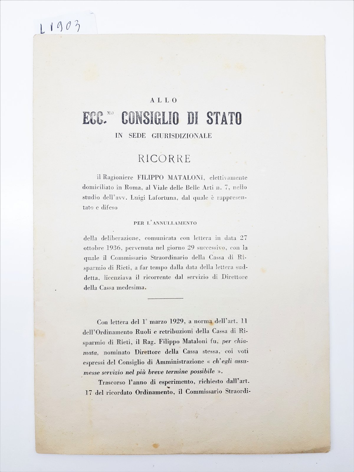 Allo ecc.mo Consiglio di Stato in sede giurisdizionale ricorre il ragioniere Filippo Mataloni per l'annullamento della delibera con la quale Il commissario straordinario della Cassa di Risparmio di Rieti licenziava