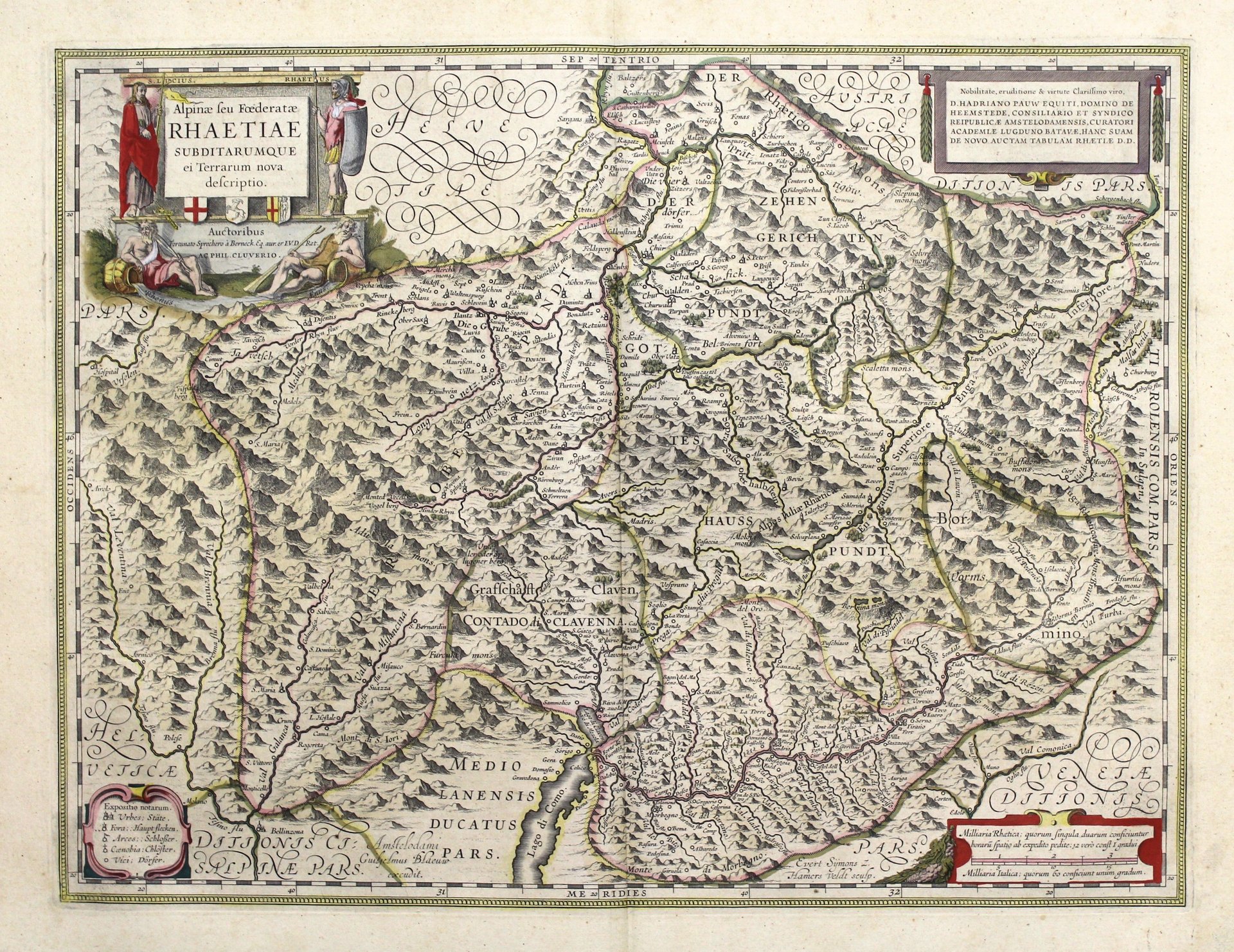 Incisione in rame, colorata d'epoca, mm 380x500, testo latino al verso. Elegante e piacevole carta, tratta da Atlas Novus, arricchita da alcuni bei cartigli decorate, ristampa dell'originale di Sprecher e Cluverio, la prima carta della Rezia. Si tratta di una modifica della lastra di Hondius del 1625, che primo riprese modificando la carta originale. La lastra di Hondius fu acquistata da Blaeu, sostituendo il nome (Vedi Sceffer 29 e Bianchi 64) Bell'esemplare. <BR>Ottimo esemplare perfettamente conservato anche se un po' ossidata la carta. W. Blaeu, astronomo allievo di Tycho Brahe, fondò un'officina per la costruzione di globi nel 1599; quasi immediatamente iniziò a pubblicare anche carte geografiche, giungendo nel 1630 alla creazione del primo atlante "Atlantis Appendix" e cinque anni dopo, della prima edizione in due tomi del "Atlas Novus". Dopo la sua morte nel 1638, a cura del figlio Johan si giunse nel 1662 alla pubblicazione del celebre "Atlas Maior" in 11 volumi. Nel 1672 un incendio distrusse l'officina e segnò la fine dell'attività. <BR>