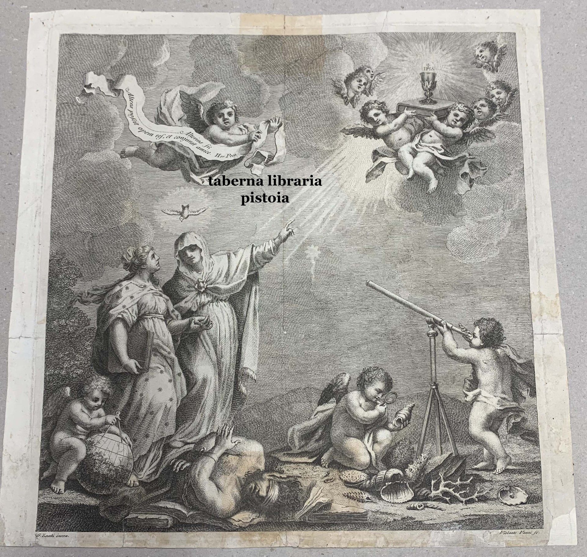 Acquaforte cm. 37x35 alla battuta + piccoli marg. binchi. Bella simbologia delle scienze