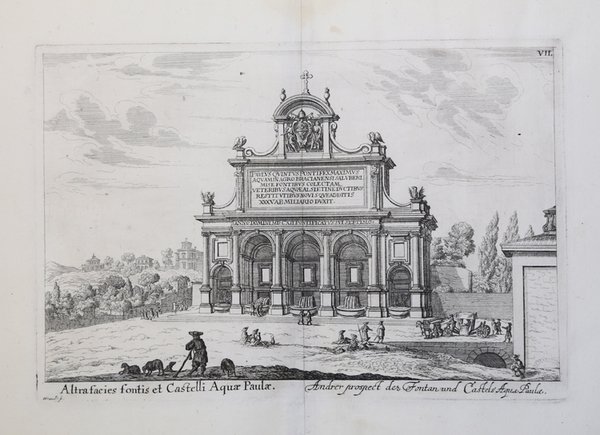 Opera tratta dalla celebre ' Academia Todesca della Architectura, Scultura & Pittura: oder Teutsche Academie der Edlen Bau, Bild-und Mahlerey-Künste, raccolta monumentale, riccamente illustrata da centinaia di incisioni raffiguranti antichità, architettura e mitologia classica, edita a Norimberga e Francoforte tra il 1675 ed il 1680. ' Questo lavoro di Sandrart, pubblicato con il titolo Romanorum Fontinalia Sive Nitidissimorum Perenniumque, Intra & Extra, Urben Roman, deriva dalla serie Le Fontane di Roma di Giovan Battista Falda edita da Giovanni Giacomo de Rossi alla Pace, in 4 volumi, intorno al 1680. Falda, che muore a Roma nel 1678, incise le tavole del primo e del secondo volume, intitolati rispettivamente dal titolo Le Fontane di Roma nelle Piazze, e Luoghi Publici Della Citta e Le fontane delle ville di Frascati, nel Tusculano. Le tavole del terzo e quarto volume, Le fontane ne' palazzi e ne' giardini di Roma e Le fontane del giardino Estense in Tivoli, furono, invece, incisi da Giovani Francesco Venturini. Per le sue incisioni, il Sandrart si avvalse dei suoi collaboratori Karl Gustav von Amling (1650-1703); Philip Kilian (1628-1693); Richard Collin (1627-97); Georg Andreas Wolfgang (1631-1716); Johann Georg Waldreich (d.1680); Melchior Küsel (1626-1683); Franck, Johann (fl.1659-1690); George Christoph Eimmart (1638-1705); Susanna Maria von Sandrart (1658-1716); Bartholomäus Kilian (1630-1696). ' L'opera è piena di illustrazioni di edifici romani antichi e moderni, scultura, teoria della pittura, biografie di artisti, tra cui artisti tedeschi e contemporanei (cioè del XVII secolo), e antichità. Joachim von Sandrart fu un pittore di una certa importanza, ma è per la sua Teutsche Academie che è principalmente ricordato. Il suo compendioso trattato include sezioni sulla scultura antica e l'architettura, la prospettiva, la teoria della pittura, biografie di artisti, una traduzione delle Metamorfosi di Ovidio e così via. La seconda parte del Libro I pretende di dare una storia dell'arte dalle sue prime origini, e si apre con un'incisione di due scene di racconti leggendari della scoperta del disegno. L'opera è dedicata alla nazione tedesca di fama mondiale e ai campioni e amanti dell'arte ('Der Welt-berühmten Teutschen Nation . Kunst-Helden und Kunstliebenden'). Acquaforte, con margini, ottimo stato di conservazione. Bibliografia National Gallery (Washington), ' Mark J. Millard, III (1998), no. 111; F.W. H. Hollstein, ' German engravings . ca. 1400-1700 ' (1954-), 38-41; Anna Schreurs, ' Unter Minerva schutz: bildung durch kunst in Joachim von Sandrarts 'Teutscher Academie' ' (2012). Plate taken fom the monumental ' Academia Todesca della Architectura, Scultura & Pittura: oder Teutsche Academie der Edlen Bau, Bild-und Mahlerey-Künste ' (Deutsche Academy of Architecture - Sculpture – Painting). ' This work by Sandrart, published under the title Romanorum Fontinalia Sive Nitidissimorum Perenniumque, Intra & Extra, Urben Roman, derives from the series Le Fontane di Roma by Giovan Battista Falda published by Giovanni Giacomo de Rossi alla Pace, in 4 volumes, around 1680. Falda, who died in Rome in 1678, engraved the plates of the first and second volume, entitled respectively Le Fontane di Roma nelle Piazze, e Luoghi Publici Della Citta and Le fontane delle ville di Frascati, nel Tusculano. The plates of the third and fourth volume, Le fontane ne' palazzi e ne' giardini di Roma and Le fontane del giardino Estense in Tivoli, were instead engraved by Giovani Francesco Venturini. The first edition, in German, was published by Joachim von Sandrart in Nuremberg, in three volumes respectively in 1675, 1679 and 1680. For the plates Sandrart used his students as and many others artist as Karl Gustav von Amling (1650-1703); Philip Kilian (1628-1693); Richard Collin (1627-97); Georg Andreas Wolfgang (1631-1716); Johann Georg Waldreich (d.1680); Melchior Küsel (1626-1683); Franck, Johann (fl.1659-1690); George Christoph Eimmart (1638-1705); Susanna Maria von Sandrart (1658-1716); Bartholomäus Kilian (1630-1696). The work is full of illustrations of ancient and modern Roman buildings, sculpture, the theory of painting, biographies of artists, including German and contemporary (ie seventeenth-century) artists, and antiquities. Joachim von Sandrart was a painter of some note but it is for his Teutsche Academie that he is chiefly remembered. His compendious treatise includes sections on ancient sculpture and architecture, perspective, the theory of painting, artists’ biographies, a translation of Ovid’s Metamorphoses and so on. The second part of Book I purports to give a history of art from its earliest origins, and opens with an engraving of two scenes of legendary accounts of the discovery of drawing. The frontispiece to Volume I is signed as drawn by J. de Sandrart and engraved by C.G. Amling; that of Volume II is signed as drawn by Sandrart and engraved by R. Collin. The portrait in Volume I is signed as painted by J.U. Mair and engraved by P. Kilian; that in Volume II is signed as engraved by R. Collin. Many plates are signed as drawn by Sandrart and engraved by R. Collin or other engravers (J. Franck, G.A. Wolfgang, J.G. Waldreich, I.I. Thourneyser, Melchior Küsell, G. C. Eimmart, B. Kilian, Jacob Sandrart, Joh. Meyer, Susanna von Sandrart, J.A. Boener, C. Meyer). Many plates are unsigned. The work is dedicated to the world-renowned German nation and to champions and lovers of art ('Der Welt-berühmten Teutschen Nation . Kunst-Helden und Kunstliebenden'). Etching with margins, very good condition. References National Gallery (Washington), ' Mark J. Millard, III (1998), no. 111; F.W. H. Hollstein, ' German engravings . ca. 1400-1700 ' (1954-), 38-41; Anna Schreurs, ' Unter Minerva schutz: bildung durch kunst in Joachim von Sandrarts 'Teutscher Academie' ' (2012). Cfr.