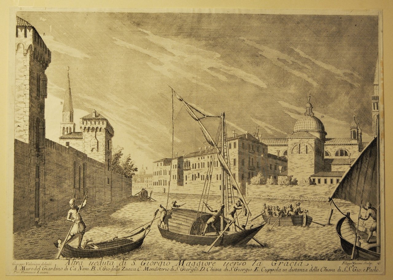 Acquaforte e bulino di mm 467 x 330. Stato I/I. Carta pastosa, spessa, fittamente vergata. Filigrana non rilevata. Margini ridotti, poco fuori della battuta. Per il resto foglio senza difetti. Nel Cartiglio al centro in grande "Altra veduta di S.Giorgio Maggiore verso la Gracia"; a sinistra "Giuseppe Valeriani delineò"; a destra "Filippo Vasconi Sculp." Sotto rimanndi "A. Muro del Giardino di Ca' Nani B. S. Gio. della Zuecca C. Monastero di S.Giorgio D.Chiesa di S. Giorgio E. Cuppola in distanza della Chiesa di S.S. Gio. e Paolo" Sotto a sinistra "Per Domenico Lovisa". Proveniente da: "Il Gran Teatro delle Pitture e Prospettive di Venezia, in due tomi diviso". Il foglio, che rappresenta l'isola di San Giorgio Maggiore, fa parte della grande opera di Domenico Lovisa, pubblicata a Venezia nel 1720. La suite si componeva di due volumi: il primo, relativo a vedute veneziane e lagunari, venne disegnato da Giuseppe Valeriani, mentre è ignoto chi ne fu l'incisore; il secondo, relativo a pitture di celebri artisti veneziani, venne realizzato da Andrea Zucchi. L'album di vedute, sebbene non eccelso da un punto di vista stilistico, rappresenta la più ampia documentazione sulla vita privata a Venezia nel 1700: la scena è sempre ricolma di azione, spesso anche spiritosa, tutta tesa ad una rappresentazione cronachistica, più che architettonica, di Venezia.Cicogna 4541, Succi 230. Etching and burin 467 x 330 mm. State I / I. Pasty, thick, thickly laid paper. Watermark not detected. Extremely small margins, just off the beaten path. For the rest sheet without defects. In the large cartouche in the center "Another view of S.Giorgio Maggiore towards the Gracia"; on the left "Giuseppe Valeriani delineò"; on the right "Filippo Vasconi Sculp." Under "A. Wall of the Garden of Ca 'Nani BS Gio. Della Zuecca C. Monastery of S. Giorgio D. Church of S. Giorgio E. Cuppola in the distance of the Church of SS Gio. E Paolo" Below left "For Domenico Lovisa ". Coming from: "The Great Theater of Paintings and Perspectives of Venice, in two volumes divided". The sheet, which represents the island of San Giorgio Maggiore, is part of the great work by Domenico Lovisa, published in Venice in 1720. The suite consisted of two volumes: the first, relating to Venetian and lagoon views, was designed by Giuseppe Valeriani, while it is unknown who was the engraver; the second, relating to paintings by famous Venetian artists, was made by Andrea Zucchi. The album of views, although not excellent from a stylistic point of view, represents the most extensive documentation on private life in Venice in the 1700s: the scene is always full of action, often also witty, all aimed at a chronicle representation, rather than architectural, of Venice. Stork 4541, Succi 230. Etching and burin 467 x 330 mm. State I / I. Pasty, thick, thickly laid paper. Watermark not detected. Extremely small margins, just off the beaten path. For the rest sheet without defects. In the large cartouche in the center "Another view of S.Giorgio Maggiore towards the Gracia"; on the left "Giuseppe Valeriani delineò"; on the right "Filippo Vasconi Sculp." Under "A. Wall of the Garden of Ca 'Nani BS Gio. Della Zuecca C. Monastery of S. Giorgio D. Church of S. Giorgio E. Cuppola in the distance of the Church of SS Gio. E Paolo" Below left "For Domenico Lovisa ". Coming from: "The Great Theater of Paintings and Perspectives of Venice, in two volumes divided". The sheet, which represents the island of San Giorgio Maggiore, is part of the great work by Domenico Lovisa, published in Venice in 1720. The suite consisted of two volumes: the first, relating to Venetian and lagoon views, was designed by Giuseppe Valeriani, while it is unknown who was the engraver; the second, relating to paintings by famous Venetian artists, was made by Andrea Zucchi. The album of views, although not excellent from a stylistic point of view, represents the most extensive documentation on private life in Venice in the 1700s: the scene is always full of action, often also witty, all aimed at a chronicle representation, rather than architectural, of Venice. Stork 4541, Succi 230