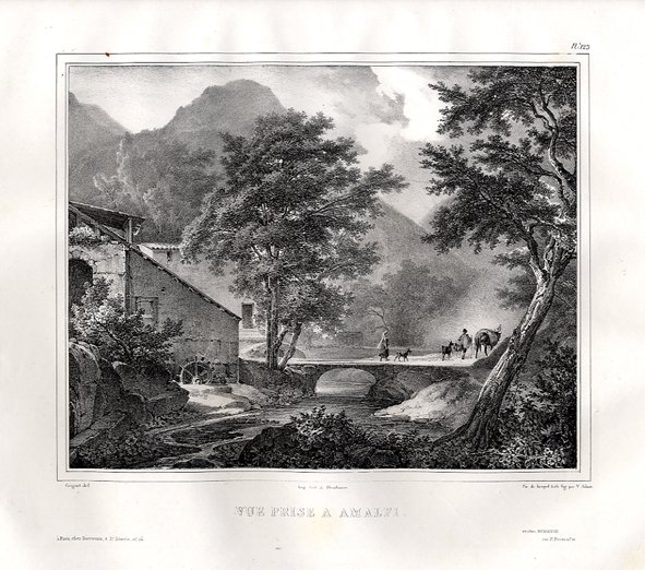 AMALFI - "Vue prise a Amalfi" Coignet del. - Pie de Leopold lith. Bel paesaggio con mulino.