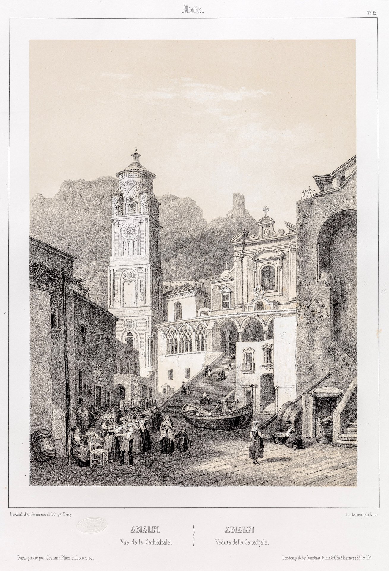 Litografia, mm 250x184 (l'immagine), pubblicata da Lemercier. Tratta da L'Italie. Collection des sites les plus renommes et des monuments les plus remarquables de ce pays. Suggestiva veduta animata da scene popolari. Bellissimo esemplare con margini editoriali molto ampi.