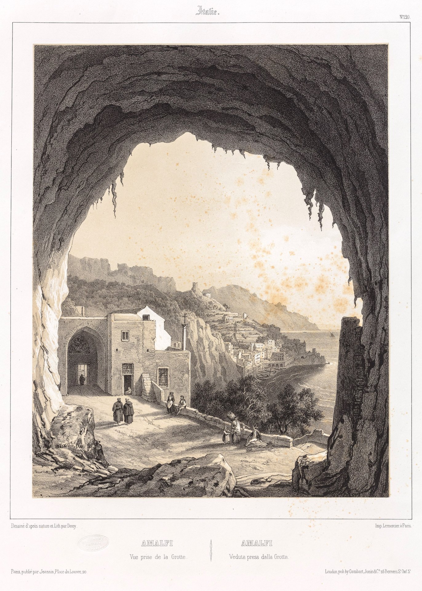 Litografia, mm 245x190 (l'immagine), pubblicata da Lemercier. Tratta da L'Italie. Collection des sites les plus renommes et des monuments les plus remarquables de ce pays. Suggestiva veduta animata da scene popolari. Ottimo esemplare con margini editoriali molto ampi, qualche leggera fioritura.