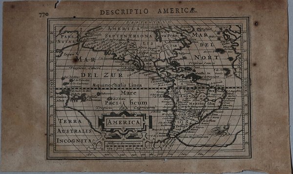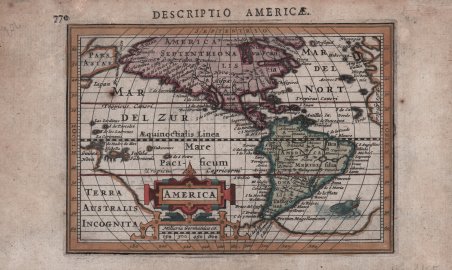 Mappa in miniatura delle Americhe basata su quella del 1606 di Jodocus Hondius, ma con l'aggiunta della scoperta più recente della Baia di Hudson nel Canada. Questa piccola mappa segna in assoluto la prima apparizione di Baia di Hudson, qui denominata ' Fretum Hudsonium, su una mappa continentale. Il Nord America è mostrato con una grossa sporgenza verso ovest, e il continente è pieno di nomi di luoghi. La costa occidentale presenta una più fitta nomenclatura rispetto alla costa orientale, tra cui ' Anian, Quivira, Tolm, Chuchuco ' e molti altri. ' Virginia, Florida, Chesepiook e St. Augustine ' sono gli unici nomi riportati sulla costa orientale. In Sud America è presente un lago, sull'equatore, vicino alla città di Manoa, e la punta meridionale del continente è quasi unita al grande e mitico continente meridionale della ' Terra Australis Incognita. La Nuova Guinea è unita a questo grande continente, e una parte del Giappone e dell'Asia appaiono nella parte superiore. La mappa è dotata di un elaborato cartiglio decorativo che incorpora la scala di miglia e un mostro marino sulla costa del Sud America. Carta geografica tratta dal ' Tabularum Geographicarum contractarum libri septem ' di Petrus Bertius, edizione latina del 1616. L'opera contiene 219 carte che illustrano questa nuova versione della geografia del Bertius, per la prima volta pubblicata nel 1612 con le carte di Barent Langenes. Le carte derivano dal grande atlante di Mercator/Hondius, delle quali molte rappresentano una semplice riduzione. "After the death of Cornelis Claesz in 1609, Jodocus Hondius II became the new publisher of the work, composed by 7 parts in 1, with engraved title-page and 220 full-page engraved maps in text. All the maps were newly engraved and slightly larger in size, because Hondius was not able to acquire the original plates. With the new plates the work was definitely improved and enjoyed a growing demand of the public, which at that time had the choice between the ' Atlas Minor ' by Mercator and Bertius' ' Tabularum Geographicarum. The 219 plates, with the oval world map appearing twice, were produced to illustrate a new version of the geography of Bertius, published in 1616. According to King, their correct attribution is by Hondius, after Mercator and Hondius, taken from Bertius, who was only responsible for revising his text again" [cfr. G. King, ' Miniature Antique Maps]. “The previous edition of Petrus Bertius' book had appeared in Frankfurt, 1612. It included the Barent Langenes plates of 1598 and the America which was first published by Claesz, 1596. Sometime after this, one would presume before 1616, they passed into the hands of Johannes Cloppenburg. Bertius' text was revised and in 1616 using a new set of plates Jodocus Hondius jr., who was related to Bertius by marriage, issued this enlarged edition. It contained many more maps than the earlier edition, all slightly larger in size. Although Hondius engraved some of the plates himself the map of America is not known to be his work. The author drew on the Hondius sr. map of America from 1606, and for the first time on a continental map incorporated the recent discovery of Hudson Bay. There are more placenames than on the earlier Claesz plate. In 1618 Petrus Bertius was appointed Cosmographer to King Louis XIII and spent the rest of his life in Paris. Sometime after the 1618 editions the plates came into the possession of Joan Blaeu. In 1637 he published an extremely rare atlas entitled Atlas Minor sive Tabulæ Geographicæ, surviving in only two known examples.", (Burden "The Mapping of North America", p. 223). Acquaforte, finemente colorata a mano, in ottimo stato di conservazione. ' Bibliografia: Burden "The Mapping of North America", p. 223, n. 183; King (2nd ed.) pp. 96-99. An uncommon miniature map of the Americas based on the 1606 map of America by Jodocus Hondius senior, but with the addition of the recent discovery of Hudson Bay. This small map marks the first appearance of Hudson Bay on a continental map, named here as Fretum Hudsonium. North America is shown with a large westward bulge, and the continent is filled with place names. The western coast has more names than the eastern coast, including Anian, Quivira, Tolm, Chuchuco and many others. Virginia, Florida, Chesepiook and St. Augustine are the only names on the East Coast. South America features the fictitious lake on the Equator, with the city of Manoa above, and the southern tip of the continent is nearly joined with the large, mythical southern continent of Terra Australis Incognita. New Guinea is shown attached to this large continent, and a portion of Japan and Asia appear above. The map is graced with an elaborate strapwork cartouche that incorporates the distance scale, and a whiskered sea monster swims off the coast of South America. Latin title page on verso. A superior rival to the pocket Ortelius atlas appeared about 1598, under the imprint of Barent Langenes and Cornelis Claesz. Claesz also published the ' Tabularum Geographicarum contractarum libri septem, edition with texy by Petrus Bertius, in 1600. After the death of Cornelis Claesz in 1609, Jodocus Hondius II became the new publisher of the work, composed by 7 parts in 1, with engraved title-page and 220 full-page engraved maps in text. All the maps were newly engraved and slightly larger in size, because Hondius was not able to acquire the original plates. With the new plates the work was definitely improved and enjoyed a growing demand of the public, which at that time had the choice between the ' Atlas Minor ' by Mercator and Bertius' ' Tabularum Geographicarum. The 219 plates, with the oval world map appearing twice, were produced to illustrate a new version of the geography of Bertius, published in 1616. According to King, their correct attribution is by Hondius, after Mercator and Hondius, taken from Bertius, who was only responsible for revising his text again. "After the death of Cornelis 
