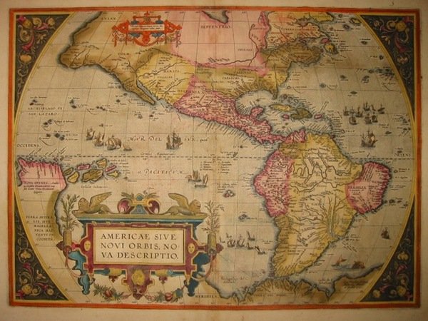 Incisione originale su rame (cm. 48,5x35,5 più ampi margini) tratta dal ‘Theatrum Orbis Terrarum’. Splendida coloritura antica all’acquarello. Abili restauri lungo la piegatura centrale e piccole mancanze ai margini bianchi destro e sinistro ma ottimo esemplare. Provenienza: Biblioteca del Castello di Cirey. Van den Broecke, 11.
