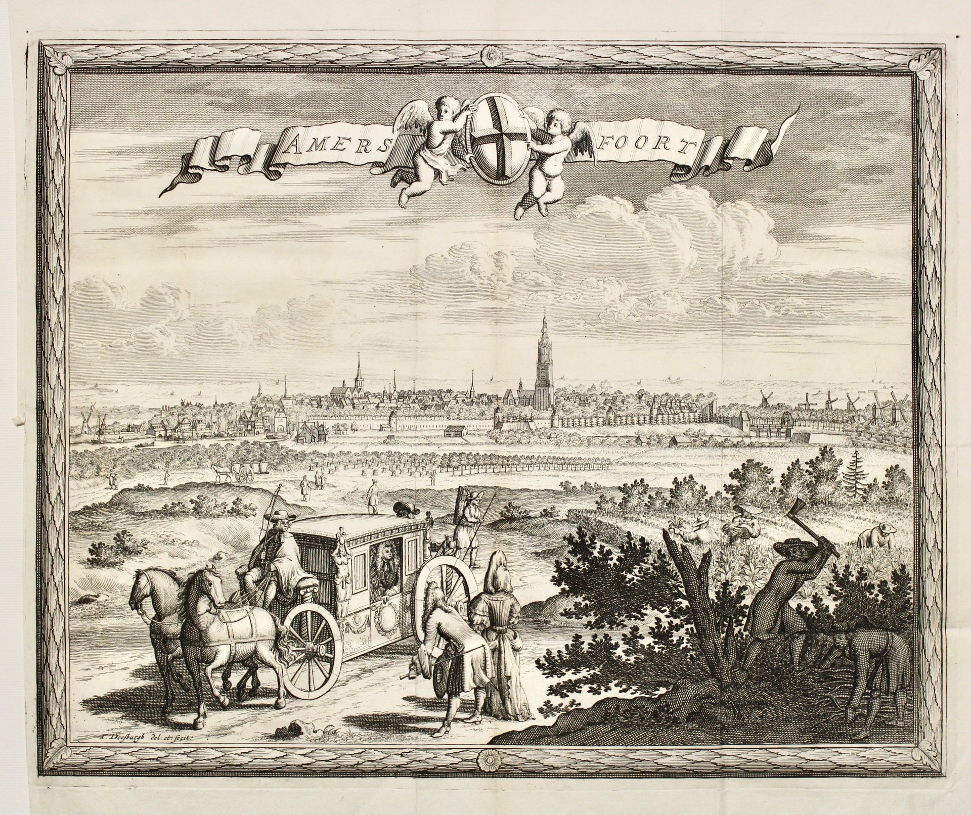 Acquaforte in rame su carta vergata a mano con marca d’acqua, mm 255x310. Disegnata e incisa da Thomas Van Doesburg, (attivo dal 1683 al 1714) che fu allievo di Romeyn de Hooghe. Fu un incisore e disegnatore attivo a Utrecht e Delft. Questo rame fu anche utilizzato come veduta di Amersfoort all’interno della bordura della grande mappa murale “Nieuwe kaart van den Lande van Utrecht" di Bernard du Roy, pubblicata da Nicolaes Visscher nel 1696. Bellissima veduta prospettica della città olandese sul fiume Eem nella provincia di Utrecht. In primo piano scena animata con una elegante carrozza. Nel centro della città di carattere medievale svetta l’Onze-Lieve-Vrouwetoren, una delle torri campanarie più alte del paesementre a sininstra si nota inoltre la splendida porta medievale ”Koppelpoort”. Ottimo esemplare con usuali pieghe editoriali.