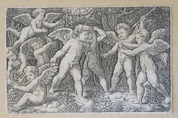 Parigi, probabile post 1525 – ante 1549. Incisione a bulino, cm 18,2 x 28,2 (l'inciso) e 18,9, 2 x 28,9 (il foglio). In lastra, in basso sulla sn., "Tappezzerie del Papa" e sulla destra il dado con la lettera B. Dalla serie delle "Tappezzerie del Papa", da un soggetto di Raffaello e edite da Antonio Lafreri, sono queste incisioni per decorazioni e ornati. Il Maestro del Dado è pittore e incisore della scuola romana di Marcantonio Raimondi, e attivo a Roma tra il 1532 e il 1550. Spesso viene confuso, a torto, con il Beatricetto o con il Bonasone. Il Le Blanc ritiene si tratti di un discendente del pittore Bernardo Daddi (1512 ca. – Roma 1570), in base all’iniziale che si legge nell’attributo figurato che sigla le sue stampe, una B segnata su un dado. Diversamente, altri lo identificano con Benedetto Verini, figlio naturale o presunto di Marcantonio, sciogliendo le iniziali BV che appaiono su alcune sue stampe, mentre, per il Bartsch, l’ultima lettera potrebbe avere il significato di Veneziano o, più recentemente (ma ancora dubitativamente), di Tommaso Vincidor da Bologna. Incisore di riproduzione di opere altrui, eseguite talvolta su richiesta di Antonio Lafrery, i suoi modelli prediletti sono Raffaello, Peruzzi, Giulio Romano e Tommaso Vincidor. Al Maestro del Dado vengono assegnate circa 85 stampe dal Malaspina, il Bartsch elenca sempre 85 sogetti, che il Passavant porta a 89. Esemplare rifilato ai margini ma con visibilela battuta della lastra, ottima impressione.