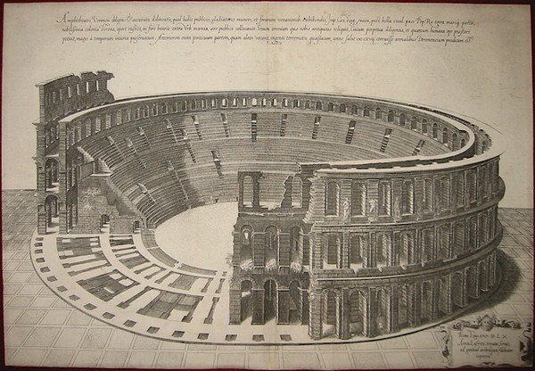 Amphitheatri Veronen. diligens & accurata delineatio, quod ludis publicis, gladiatorio muneri, et ferarum venationib. exhibendis, Imp. Caes. Aug. suasu, post bella civil. pace Pop. Ro. terra mari(que) parta nobilissima colonia Verona, opere rustico, in foro boario extra Urb. moenia, aere publico collocavit.