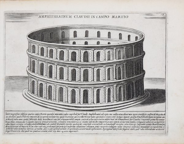Tavola tratta dal celebre Antiquae urbis splendor di Giacomo Lauro, opera di grande importanza storica e archeologica che l’autore iniziò nel 1612. Il titolo intero è: Antiquae urbis splendor, hoc est praecipua eiusdum templa, amphitheatra, theatra, circi, naumachie, arcus triumphales, mausolea aliaque sumptuosiora aedificia, pompae item triumphalis et colossaearum imaginum descriptio; opera & industria Iacobi Lauri Romani in aes incisa atque in lucem edita. Addita est breuis quaedam et succincta imaginum explicatio in qua regum consulum imperatoruq; res gestae et rei romanae origo progressus incrementum, ac finis cu almae urbis antiquor. ac modernor. vestigior. additione utcunq; hoc insequenti anno 1630 reperiutur, et ex veteru ac recentior. historiar. monumentis clare ostenditur. Il libro ha una lunga e varia storia di pubblicazione, a partire dal 1612, anche se il lavoro di Lauro sul libro precede la sua pubblicazione di almeno diciotto anni. Il libro fu stampato per la prima volta da Giacomo Mascardi, e originariamente conteneva solo due parti, anche se nel 1615 si era allargato a una terza parte. La prima parte conteneva 37 incisioni, con una dedica al re Sigismondo III di Polonia, datata 1614, e un ritratto datato 1609 (preso in prestito da un altro libro di incisioni). La seconda parte conteneva un ritratto di Carlo Emanuele I, duca di Savoia, datato 1613, e 41 incisioni. Vale la pena notare che questi primi due libri erano entrambi dedicati alla nobiltà polacca, probabilmente a causa del fatto che Lauro aveva goduto di patrocinio dall'incisione di battaglie polacche all'inizio della sua carriera. La terza parte, aggiunta più tardi, era dedicata a Ranuccio Farnese, uno dei maggiori mecenati di Lauro più tardi nella sua vita, e conteneva 40 incisioni. Il numero di tavole incluse in ciascuna delle precedenti edizioni dell'opera di Lauro (stampate alla Camera Apostolica nel 1614 in quattro parti, e stampate di nuovo lì nel 1621 in tre parti) fu finalmente stabilito nel 1628 con l'aggiunta del quarto e ultimo libro per un totale di 166 incisioni, che è il numero generalmente accettato per quante incisioni totali Lauro produsse per quest'opera. L'edizione pubblicata da Vitale Mascardi e curata da Giovanni Alto uscì nel 1637. Alto ha aggiunto un indice finale e numerato ciascuna delle incisioni, 2-167, per quest'ultima edizione. Incisione in rame, stampata su carta vergata coeva, con margini, in ottimo stato di conservazione. Plate taken from the important Antiquae urbis splendor by Giacomo Lauro. The full title is: Antiquae urbis splendor, hoc est praecipua eiusdum templa, amphitheatra, theatra, circi, naumachie, arcus triumphales, mausolea aliaque sumptuosiora aedificia, pompae item triumphalis et colossaearum imaginum descriptio; opera & industria Iacobi Lauri Romani in aes incisa atque in lucem edita. Addita est breuis quaedam et succincta imaginum explicatio in qua regum consulum imperatoruq; res gestae et rei romanae origo progressus incrementum, ac finis cu almae urbis antiquor. ac modernor. vestigior. additione utcunq; hoc insequenti anno 1630 reperiutur, et ex veteru ac recentior. historiar. monumentis clare ostenditur. The book has a long and varied history of publishing, beginning in 1612, though Lauro’s work on the book predates its publishing by at least eighteen years. The book was first printed by Giacomo Mascardi, and it originally only contained two parts, though by 1615 it had expanded to a third part. The first part contained 37 engravings, with a dedication to King Sigismund III of Poland, dated 1614, and a portrait dated 1609 (borrowed from another book of engravings). The second part contained a portrait of Charles Emmanuel I, Duke of Savoy, dated 1613, and 41 engravings. It is worth noting that these first two books were both dedicated to Polish nobility, probably due to the fact that Lauro had enjoyed patronage from engraving Polish battles early in his career. The third part, added later, was dedicated to Ranuccio Farnese, one of Lauro’s greater patrons later in his life, and contained 40 engravings. The number of plates included in each of the earlier editions of Lauro’s work (printed at the Camera Apostolica in 1614 in four parts, and printed there again in 1621 in three parts) was finally settled in 1628 with the addition of the fourth and final book for a total of 166 engravings, which is the generally accepted number for how many engravings total Lauro produced for this work. The edition published by Vitale Mascardi and curated by Giovanni Alto was released in 1637. Alto added a final index and numbered each of the engravings, 2-167, for this latest release. Copperplate, printed on contemporary laid paper, with margins, good condition. Cfr. Rossetti, Rome: A Bibliography. Vol. 3. (2000) p. 39-40.; Buckley, The Splendors of Ancient Rome: A Seventeenth Century View. The Splendors of Ancient Rome (1974); Laura Di Calisto, Lauro Giacomo in Dizionario Biografico Degli Italiani_ Vol. 64. (2005).