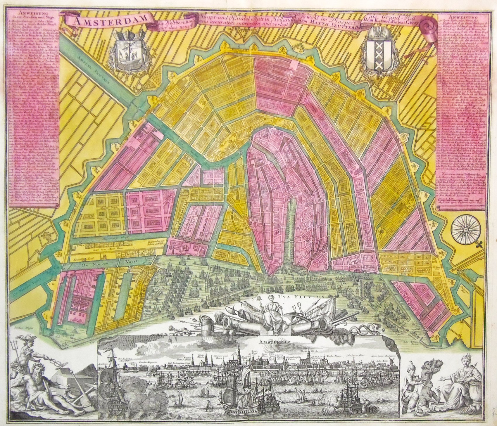 Incisione in rame, coloritura originale d'epoca della pianta della città di Amsterdam con fascinosa veduta della stessa in basso in bianco nero e ricchi cartigli con figure allegoriche e stemmi. mm 495x580. Seutter, dopo un apprendistato presso Homann a Norimberga, trasferitosi ad Augsburg verso il 1720, aprì la propria attività superando il maestro sotto il profilo della bellezza: le sue carte hanno sempre colori brillanti e cartigli elaborati. Esemplare in eccezionale stato di conservazione. <BR>Copperplate, original colour, mm 495x580. Good example in fine original colour, some waterstain recognizable on the back. Seutter, after having worked with Homann in Nuremberg, opened his own activity in Augsburg around 1720. His maps always have elaborate cartouches and are very decorative and printed on good paper. <BR>