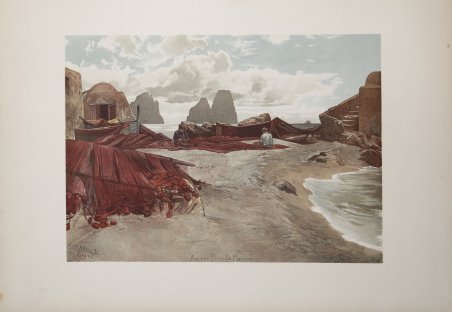Litografia a colori, 1892 firmata da C. W. Allers. Christian Wilhelm Allers (Amburgo, 6 agosto 1857 – Karlsruhe, 19 ottobre 1915) è stato un disegnatore, pittore e illustratore tedesco. Figlio di un commerciante, iniziò a lavorare come litografo e nel 1877 si trasferì a Karlsruhe dove continuò in tale professione. Alla Kunstakademie (l'accademia statale di belle arti) fu studente del Professor Ferdinand Keller. Allers divenne noto quando pubblicò la sua collezione di stampe, Club Eintracht nel 1888. Seguirono diversi altri libri e raccolte di stampe (ad esempio una su Bismarck), tanto che all'inizio degli anni 1890 fu in grado di farsi costruire una villa a Capri, dove visse per molti anni, passando del tempo anche ad Amburgo, a Karlsruhe, e viaggiando per il mondo. C.W. Allers fu un artista naturalista. I suoi disegni sono ricchi di dettagli e hanno uno stile realistico. Perfetto stato di conservazione. Color lithograph, 1892 signed by W. Allers. ' Christian Wilhelm Allers (Hamburg, August 6, 1857 - Karlsruhe, October 19, 1915) was a German draftsman, painter and illustrator. The son of a merchant, he began working as a lithographer and in 1877 moved to Karlsruhe where he continued in that profession. At the Kunstakademie (the state academy of fine arts) he was a student of Professor Ferdinand Keller. Allers became well-known when he published his print collection, Club Eintracht in 1888. Several other books and print collections followed (for example, one on Bismarck), so much so that in the early 1890s he was able to have a villa built in Capri, where he lived for many years, also spending time in Hamburg, Karlsruhe, and traveling the world. C.W. Allers was a naturalist artist. His drawings are rich in detail and have a realistic style. Perfect state of preservation. Cfr.