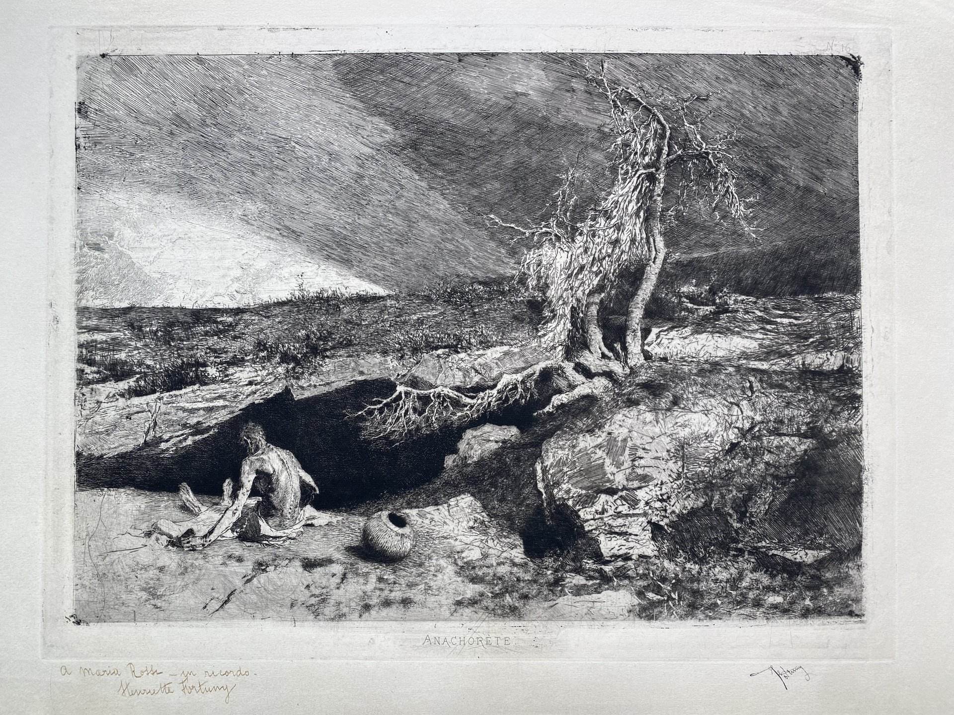 Nel foglio protagonista è il paesaggio spoglio e inospitale dal cielo plumbeo. In basso sulla sinistra, sopraffatto dalla natura, viene rappresentato un uomo seduto a terra. A torso nudo di spalle allo spettatore affiancato da un vaso. L'incisione è considerata il capolavoro dell'autore per la sua forza espressiva e per la maestria nella resa del chiaroscuro. Stato definitivo, tiratura 1878, titolo inciso in basso e numero 16 in lastra in altro a destra. Timbro con fac-simile della firma. Dedica a penna oltre l'inciso: A Maria Rossi-in ricordo. Henriette Fortuny (moglie del figlio Mariano Fortuny y Madrazo). Il disegno preparatorio è conservato presso il British Museum (inv. 1950,0520.18).