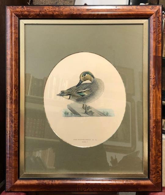 Pubblicata a Stoccolma dalla stamperia fondata da A. (Algernon) Börtzells (nell'angolo in basso a destra, qui coperto dal passepartout) verso il 1890 circa. Da un disegno di Wright, litografia stampata in colore, cm 35 x 40 circa (al foglio). Bellissima stampa che raffigura una anatra alzavola (Anas Crecca). La tavola è firmata da Wilhelm von Wright e fu delineata per l'opera ornitologica più celebre del primo novecento: “Svenska fåglar, efter naturen och på sten ritade”. “Svenska fåglar”, ossia “Uccelli svedesi”, è una magnifica raccolta di stampe ornitologiche in cromolitografia basate sui disegni dei tre fratelli finlandesi Magnus, Wilhelm e Ferdinand von Wright, pittori autodidatti dediti principalmente ai temi naturalistici e divenuti molto famosi perla bellezza delle loro opere. Magnus, nato nel 1805, si trasferì in Svezia e aprì la strada al fratello Wilhelm a cui nel 1855 una malattia invalidante impedì la prosecuzione dei suoi lavori; Ferdinand, il più giovane, scomparso nel 1906, ebbe una carriera lunga e dei tre è considerato il più abile. legante passepartout ovale color verde oliva con bordo oro a smusso, il tutto montato entro elegante cornice in radica con piano dorato. Ottimo stato di conservazione.