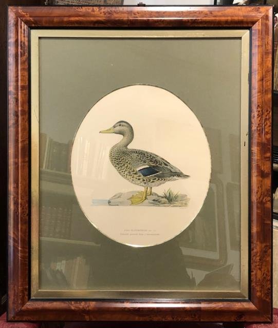Pubblicata a Stoccolma dalla stamperia fondata da A. (Algernon) Börtzells (nell'angolo in basso a destra, qui coperto dal passepartout) verso il 1890 circa. Da un disegno di Wright, litografia stampata in colore, cm 35 x 40 circa (al foglio). Bellissima stampa che raffigura una anatra alzavola (Anas Platyrhyncha). La tavola è firmata da Wilhelm von Wright e fu delineata per l'opera ornitologica più celebre del primo novecento: “Svenska fåglar, efter naturen och på sten ritade”. “Svenska fåglar”, ossia “Uccelli svedesi”, è una magnifica raccolta di stampe ornitologiche in cromolitografia basate sui disegni dei tre fratelli finlandesi Magnus, Wilhelm e Ferdinand von Wright, pittori autodidatti dediti principalmente ai temi naturalistici e divenuti molto famosi perla bellezza delle loro opere. Magnus, nato nel 1805, si trasferì in Svezia e aprì la strada al fratello Wilhelm a cui nel 1855 una malattia invalidante impedì la prosecuzione dei suoi lavori; Ferdinand, il più giovane, scomparso nel 1906, ebbe una carriera lunga e dei tre è considerato il più abile. legante passepartout ovale color verde oliva con bordo oro a smusso, il tutto montato entro elegante cornice in radica con piano dorato. Ottimo stato di conservazione. .