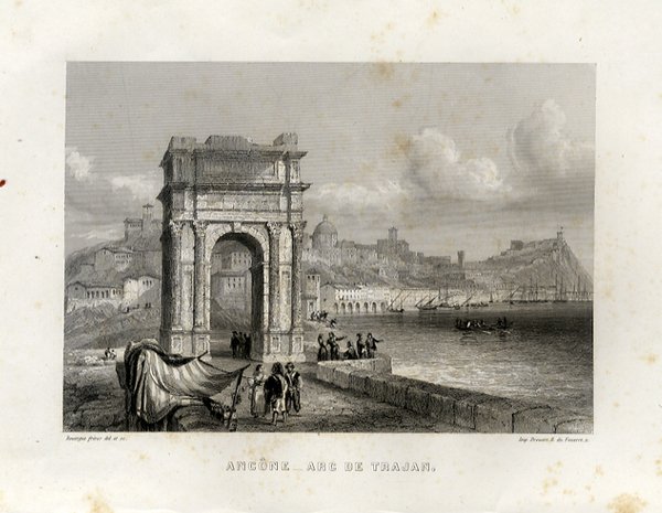 ANCONA - "Ancone - Arc de Trajan", bella veduta dell'arco con mare sulla destra e mercanti in primo piano.
