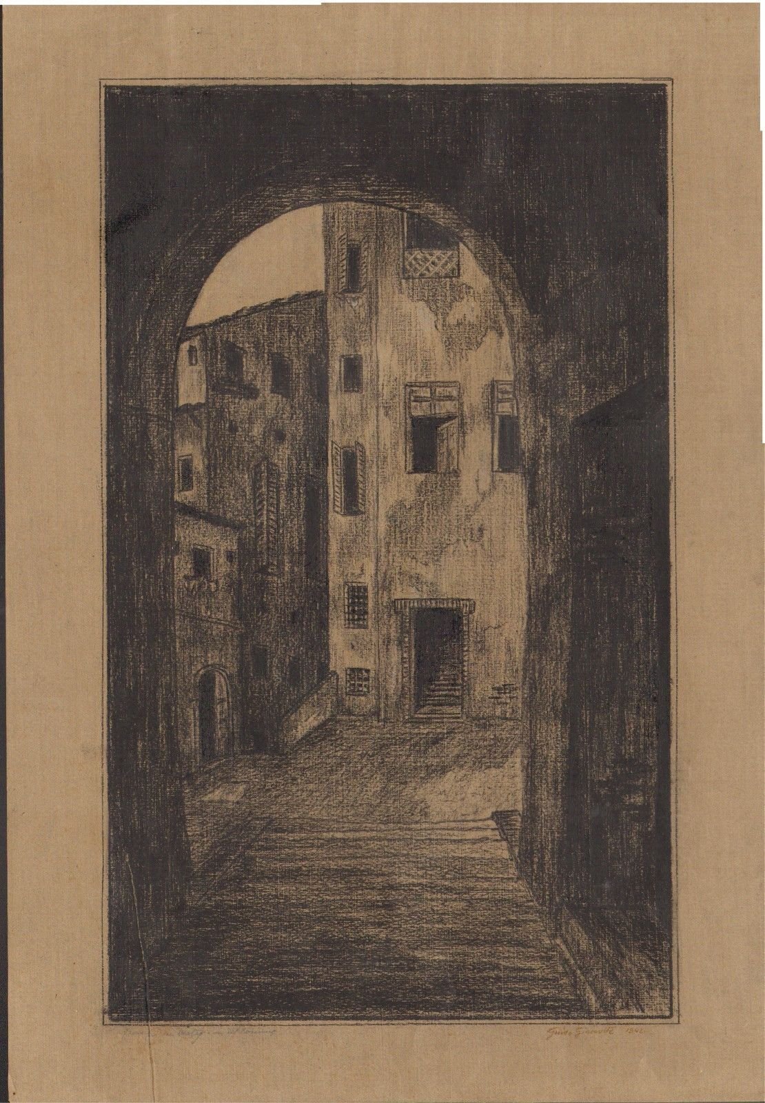ANCONA TRAVERSA VIA MATAS VIA DEL COMUNE DISEGNO FIRMATO E DATATO GUIDO GIANVITI 1942 CM. 40,5 X 24,5 IL DISEGNO. BELLISSIMO DISEGNO DI UN ARTISTA POCO NOTO MA DI OTTIMA MANO, REALIZZATO DURANTE LA GUERRA. ORIGINALE TECNICA MISTA, CARBONCINO, MATITA NERA E GESSETTO DEDICA AUTOGRAFA DELL'AUTORE SUL RETRO A ALDO SALVOLINI L 4518